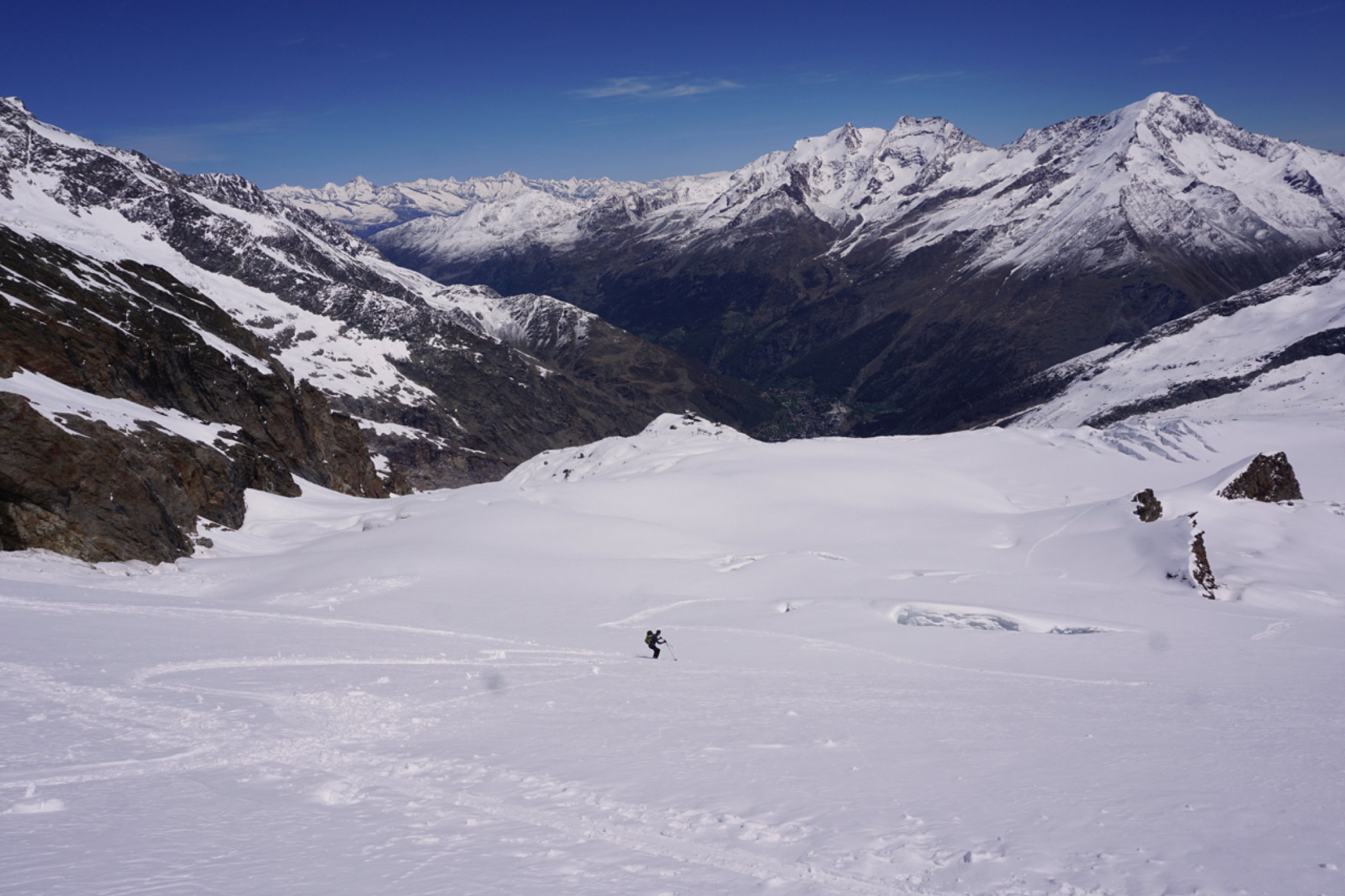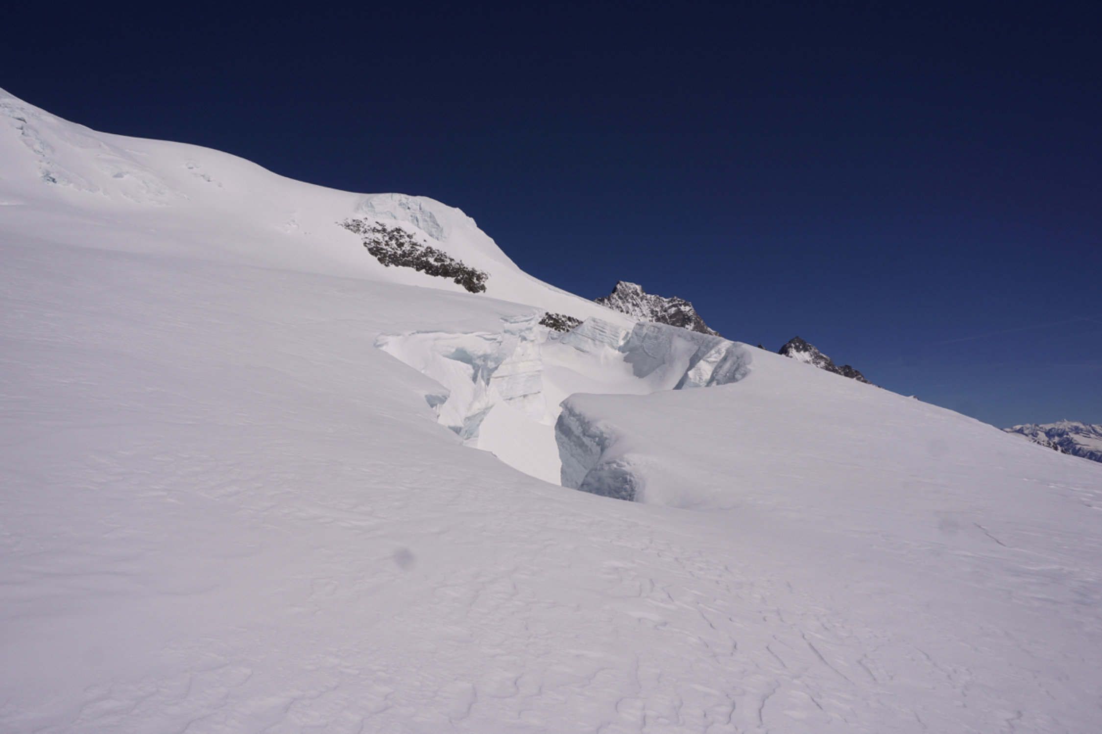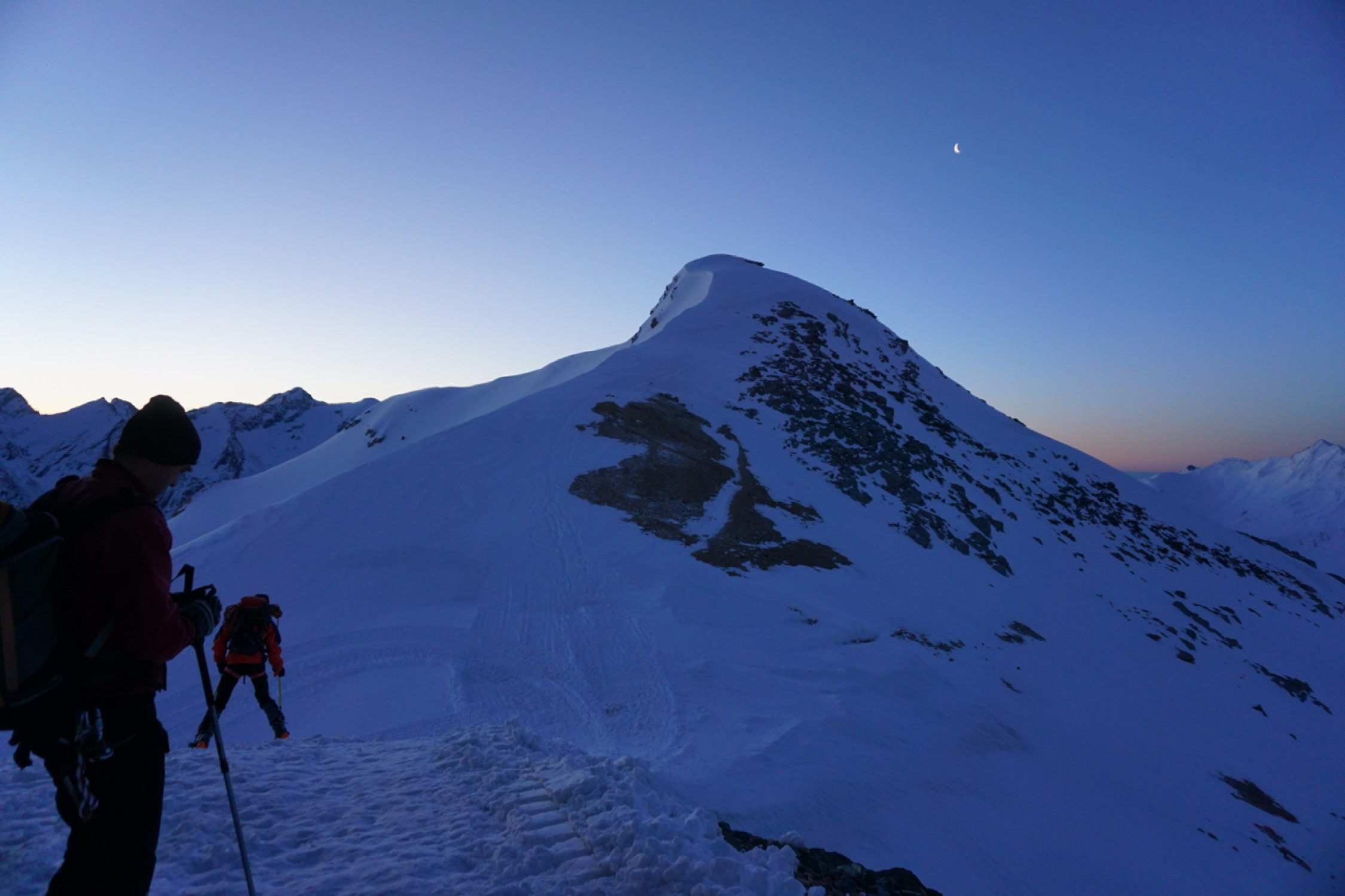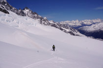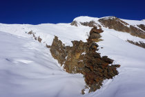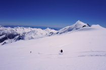 Couloir zum Gipfelplateau triebschneebeladen, sehr warm, Frühstückszeit in der Britania 5 Uhr zu spät für sonnenbeschienen Alphubel, ausgewichen auf den Grat westlich (so hoch er mit Skis noch zu erreichen ist).