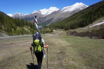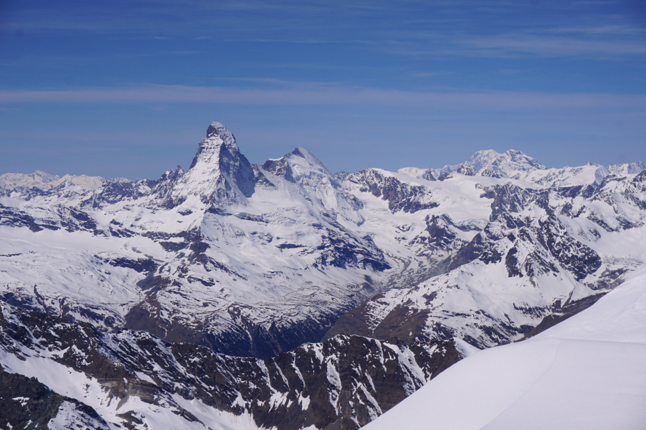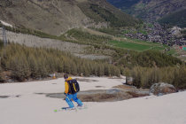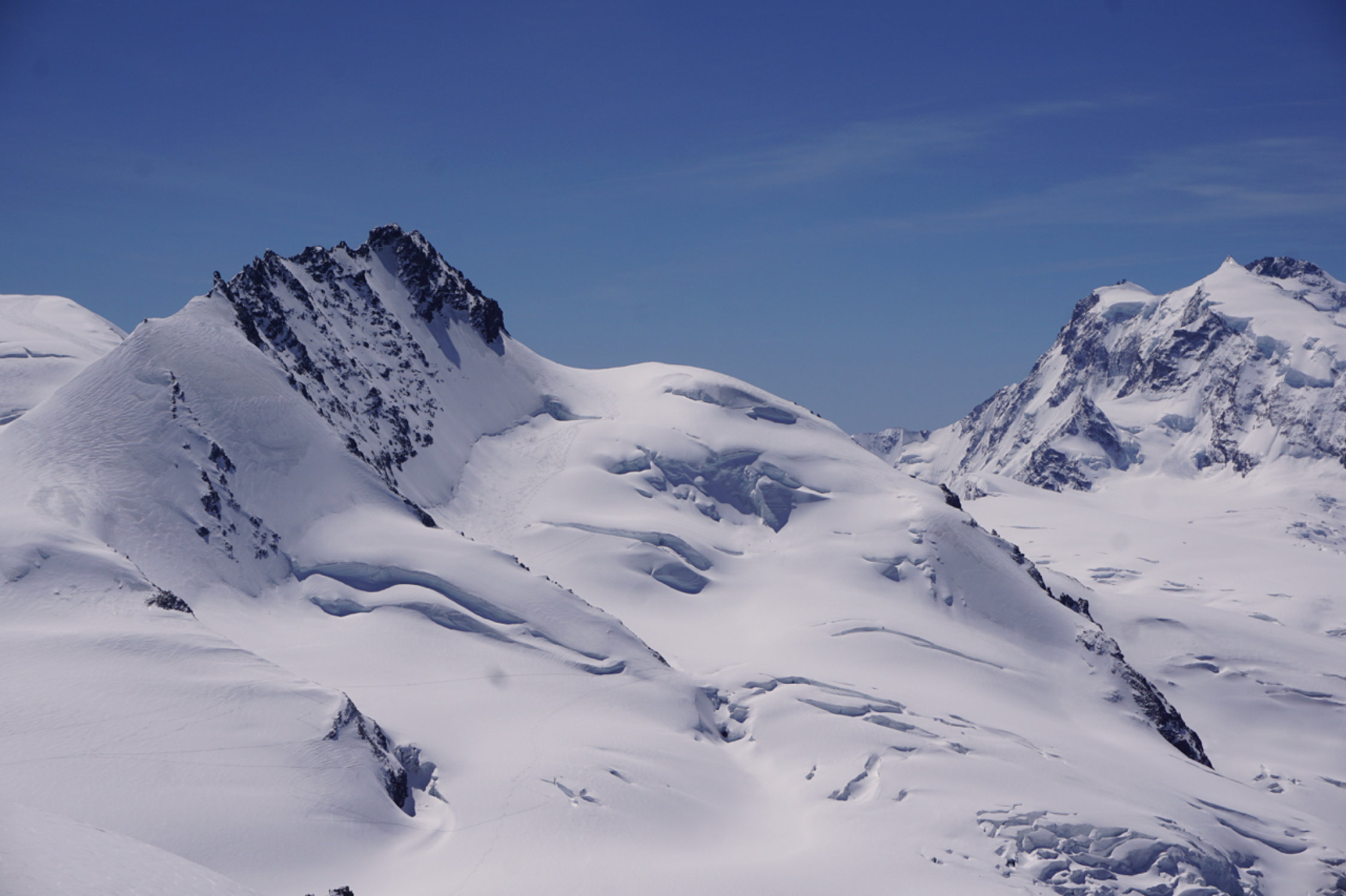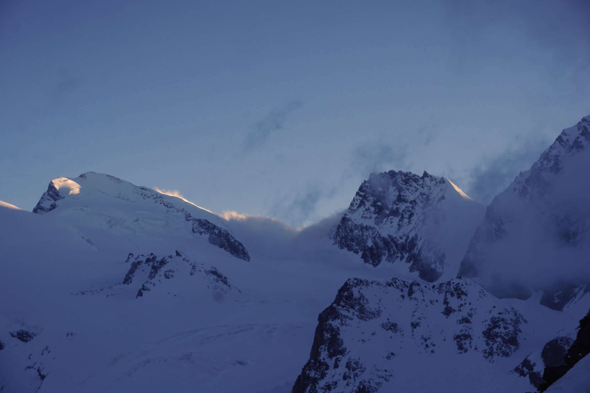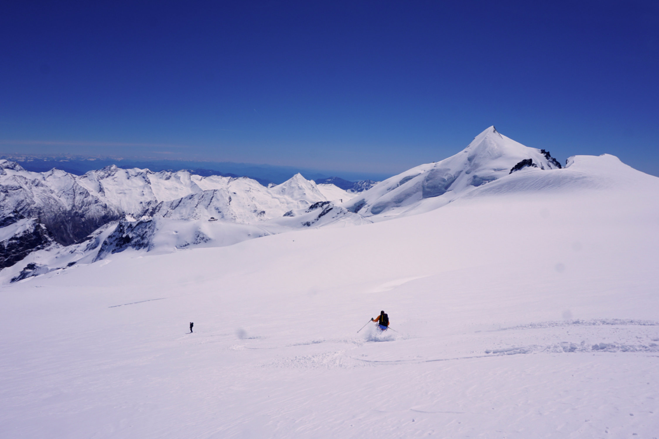 Couloir zum Gipfelplateau triebschneebeladen, sehr warm, Frühstückszeit in der Britania 5 Uhr zu spät für sonnenbeschienen Alphubel, ausgewichen auf den Grat westlich (so hoch er mit Skis noch zu erreichen ist).