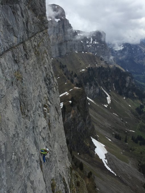 Die Route könnte man durchaus als Geheimtipp bezeichnen. Der Fels überraschend fest und die Kletterei sehr athletisch bei guter Absicherung. Ich kenne in der Schweiz wenig Routen in dem Schwierigkeitsgrad, die derart ausgesetzt durch eine wirklich schöne Wand direkt auf den Gipfel führen.