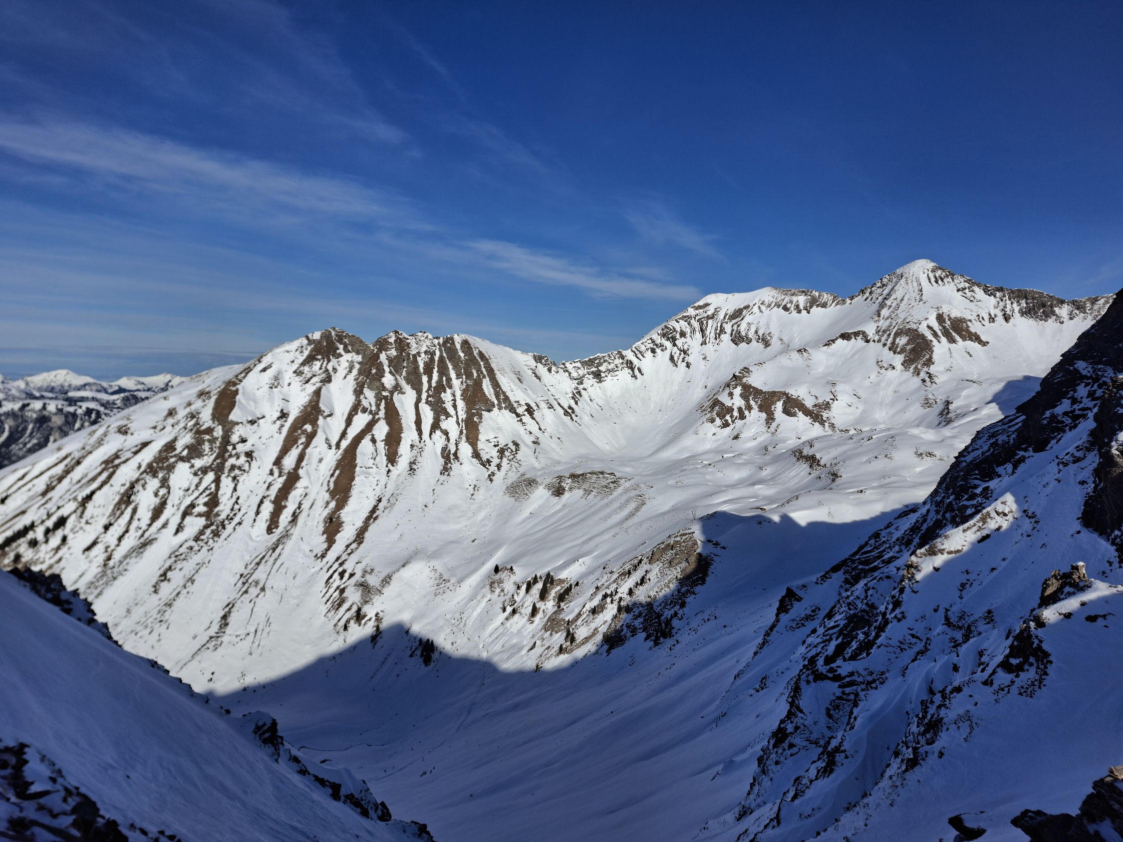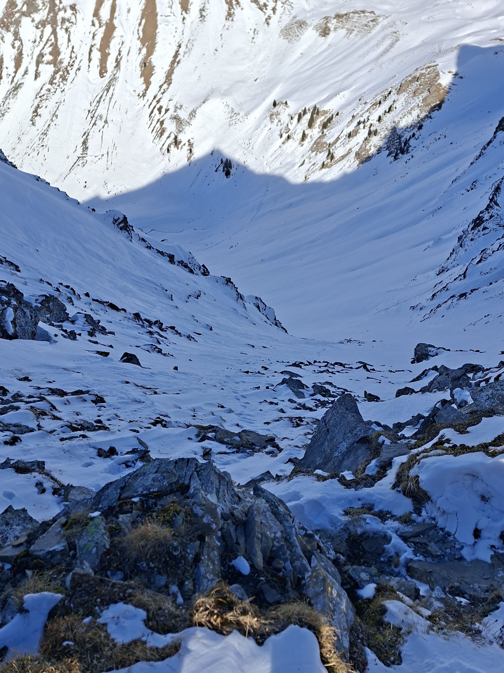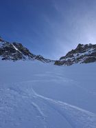 Abfahrt: In den obersten 20 Hm sind die Felsen nur schwach mit Schnee überdeckt, dann aber viel Pulverschnee. Der obere Teil Steibode Pulver, der untere Teil gesetzter Pulver.
