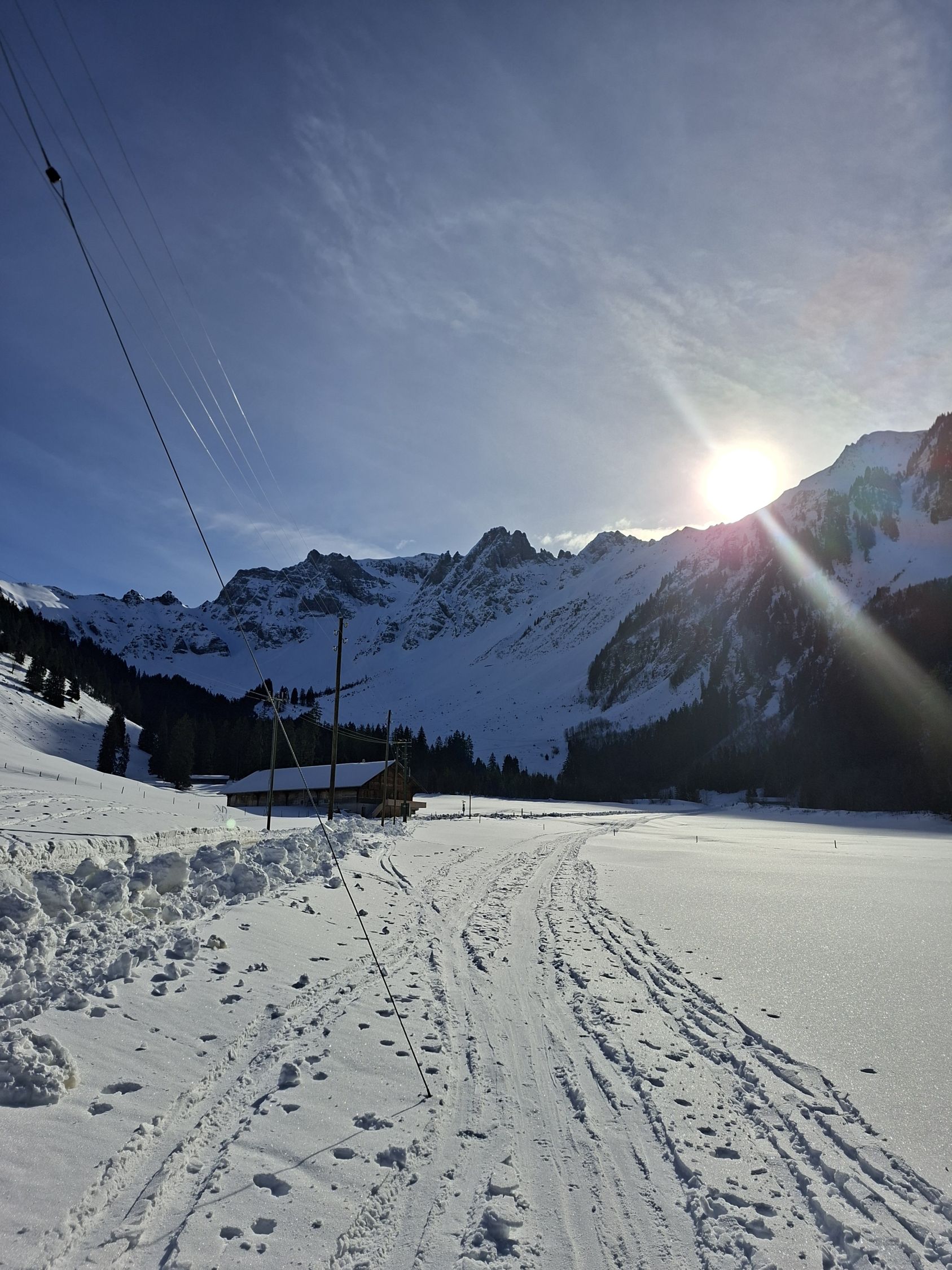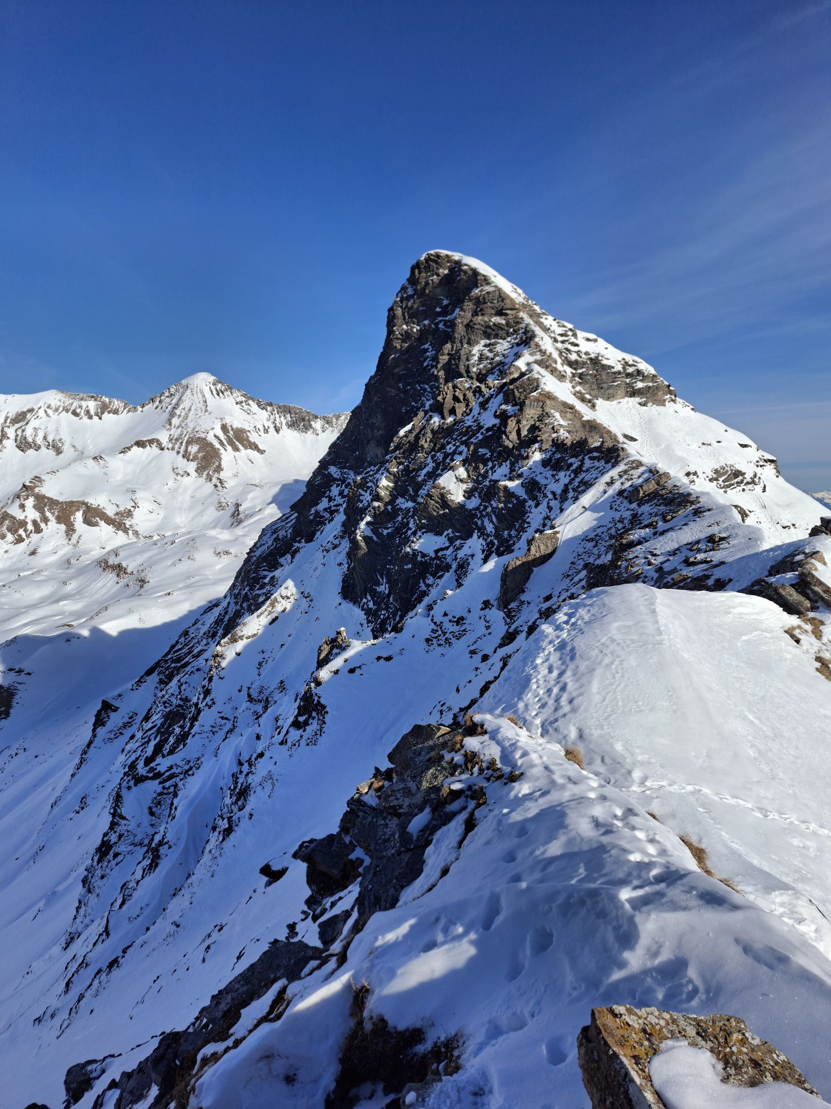 Aufstieg: Vom Hindere Fieldrich links haltend durch den Wald hoch. Es ist alles mit Skis möglich, aber die Spur ist manchmal etwas eisig. Dann weiter Richtung Mittelberg / Oberberg. Oberhalb des Waldes ist der Schnee hart oder es hat Bruchharsch, dann Richtung Oberberg Pulver. Ab Oberberg bis Scharte auf 2331 m. ü. M. hat es Pulver. Die letzten 100 Hm habe ich zu Fuss gemacht, ist aber auch mit Ski möglich.