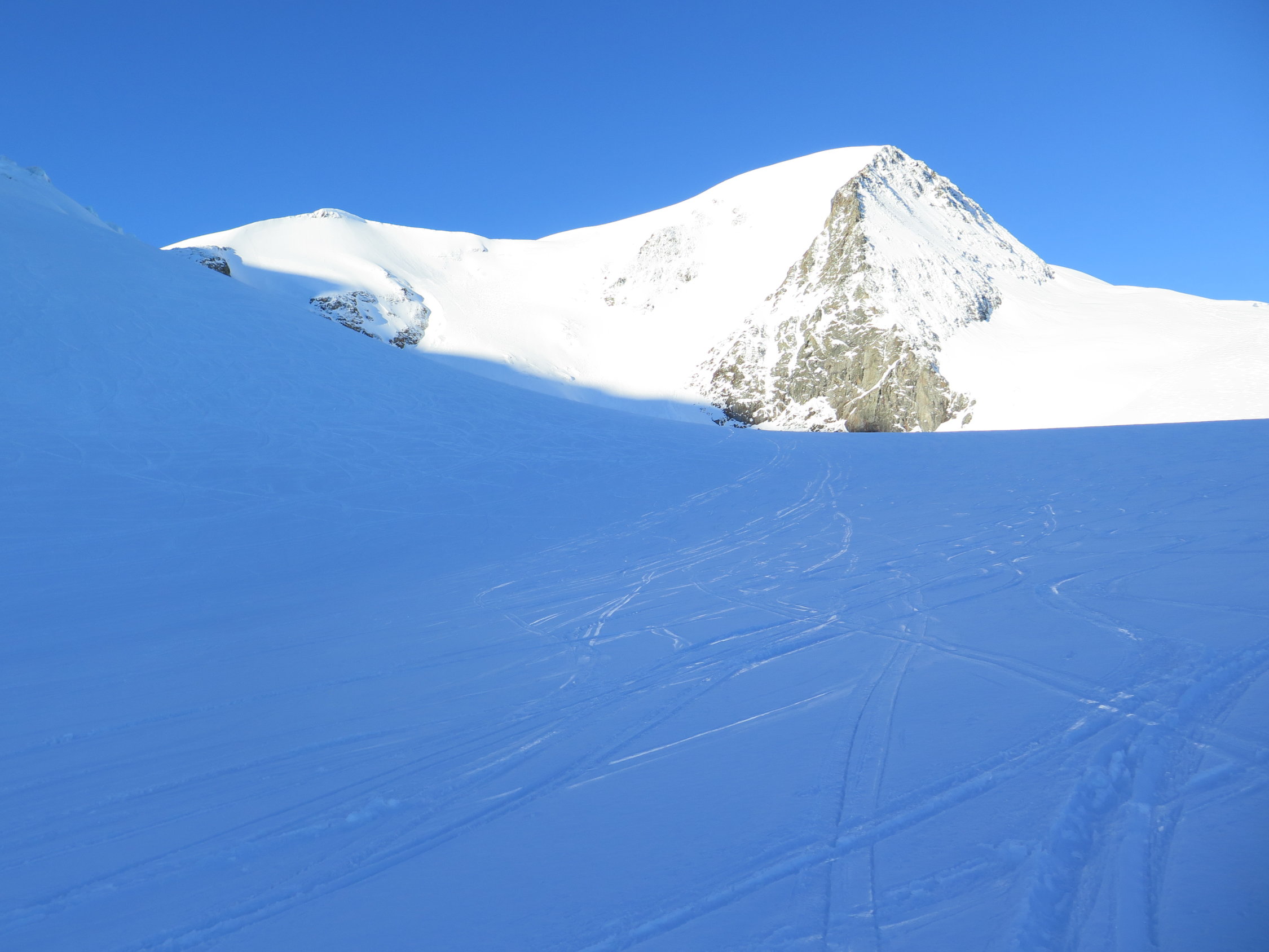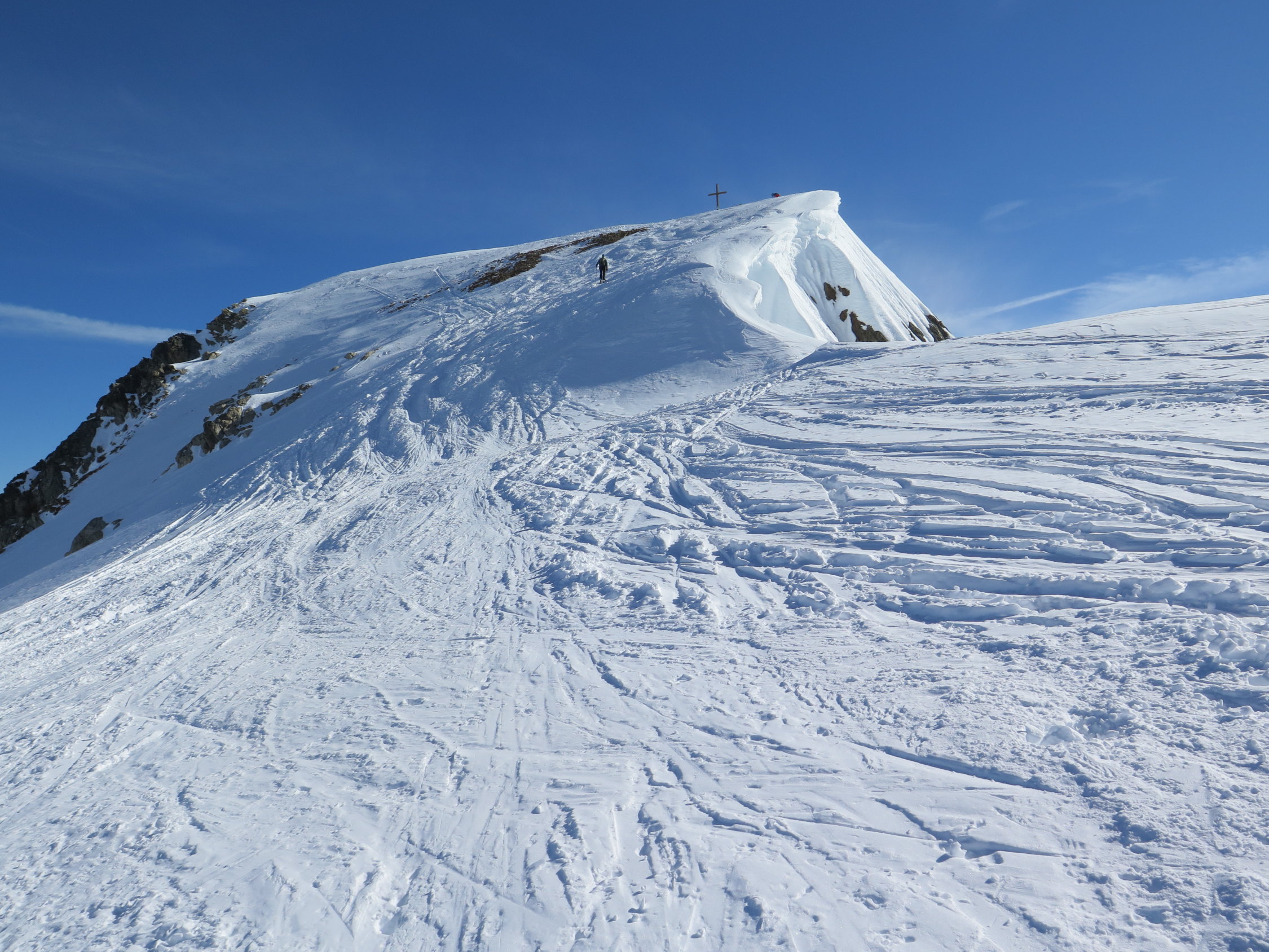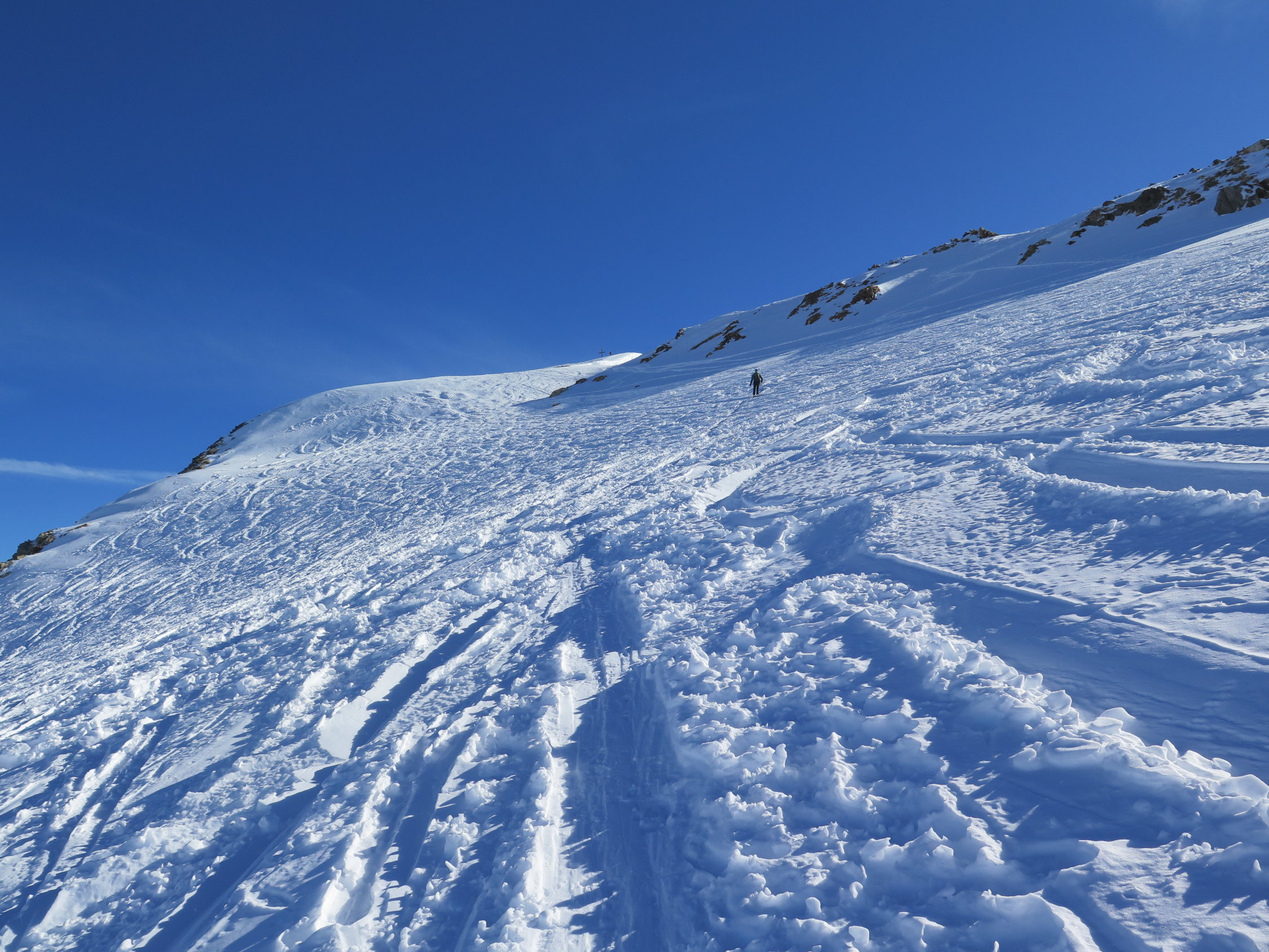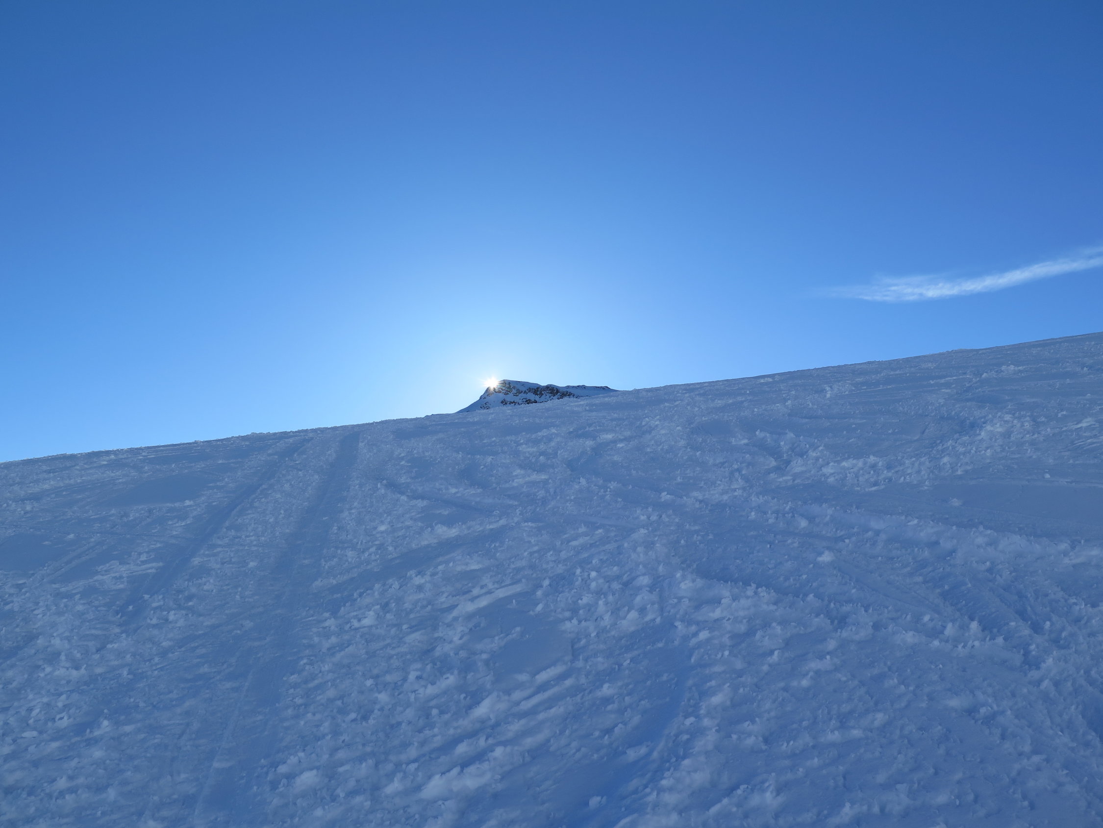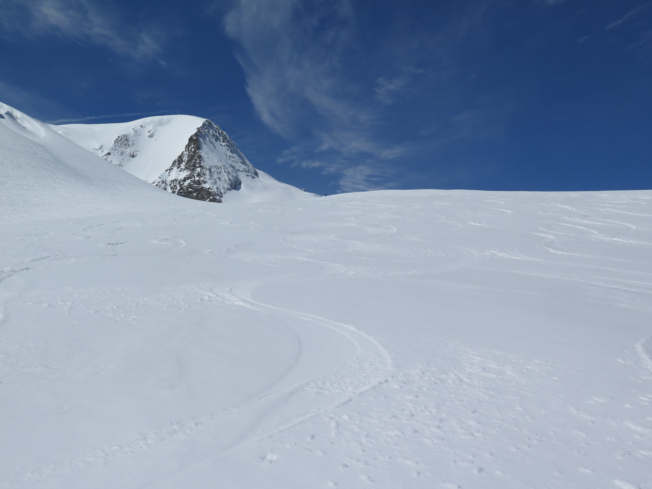 Am Gipfel wehte ein Kühler Luft. Nach 40 minütiger Gipfelrast hielt ich die kälte nicht mehr aus und fuhr bis unterhalb Gipfelhang. Dieser wahr um 10 Uhr immer noch Hart. Störend waren aber nur die vielen Tiefschneespuren von Samstag und Sonntag. Aber es hatte noch freie Stellen.