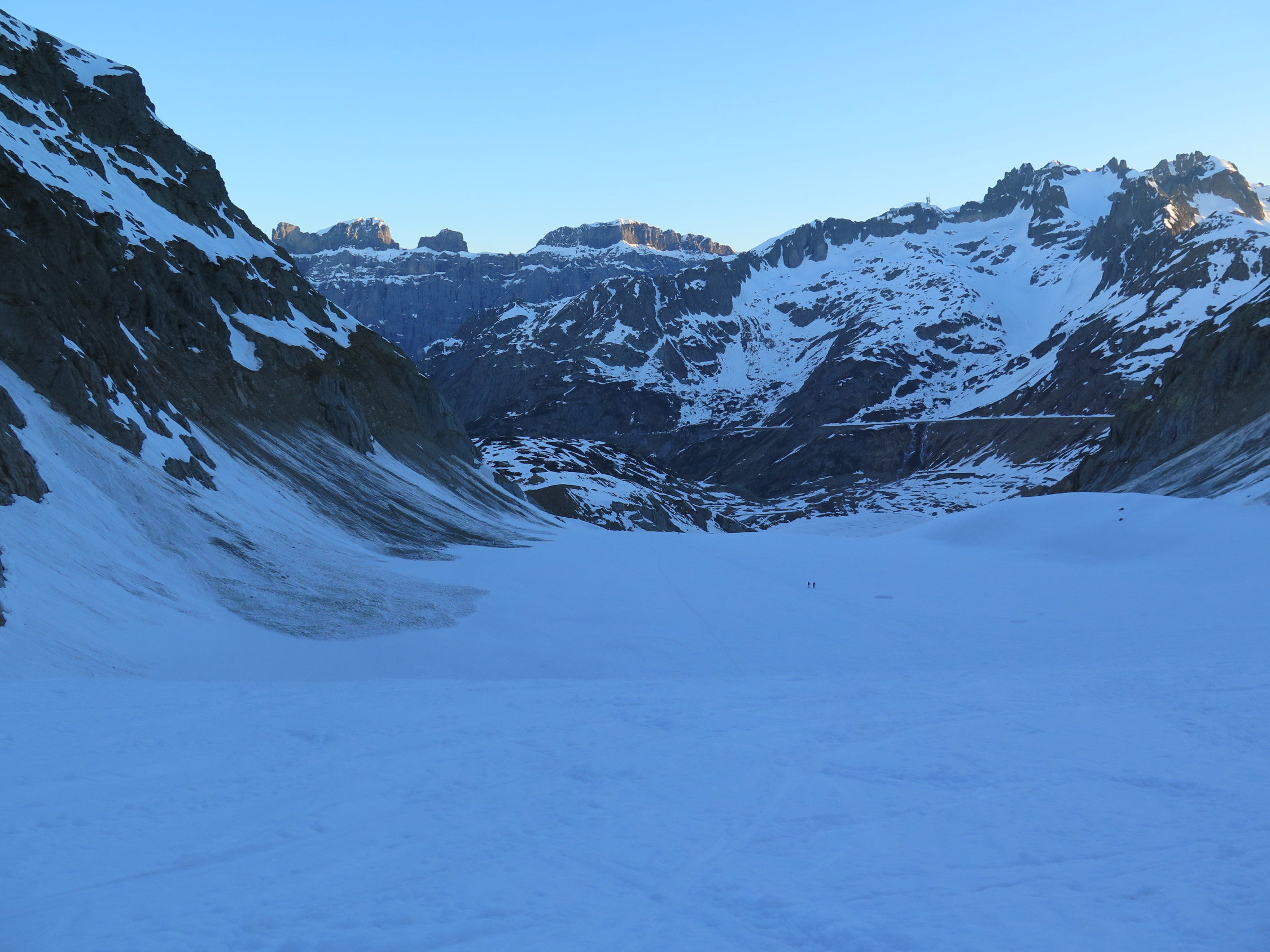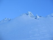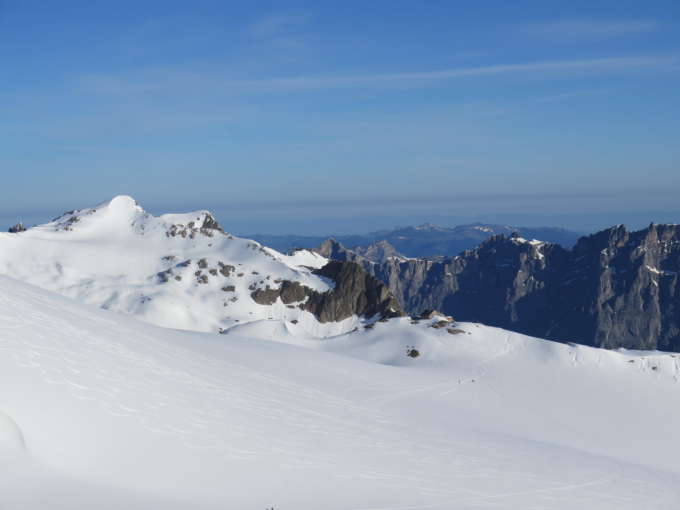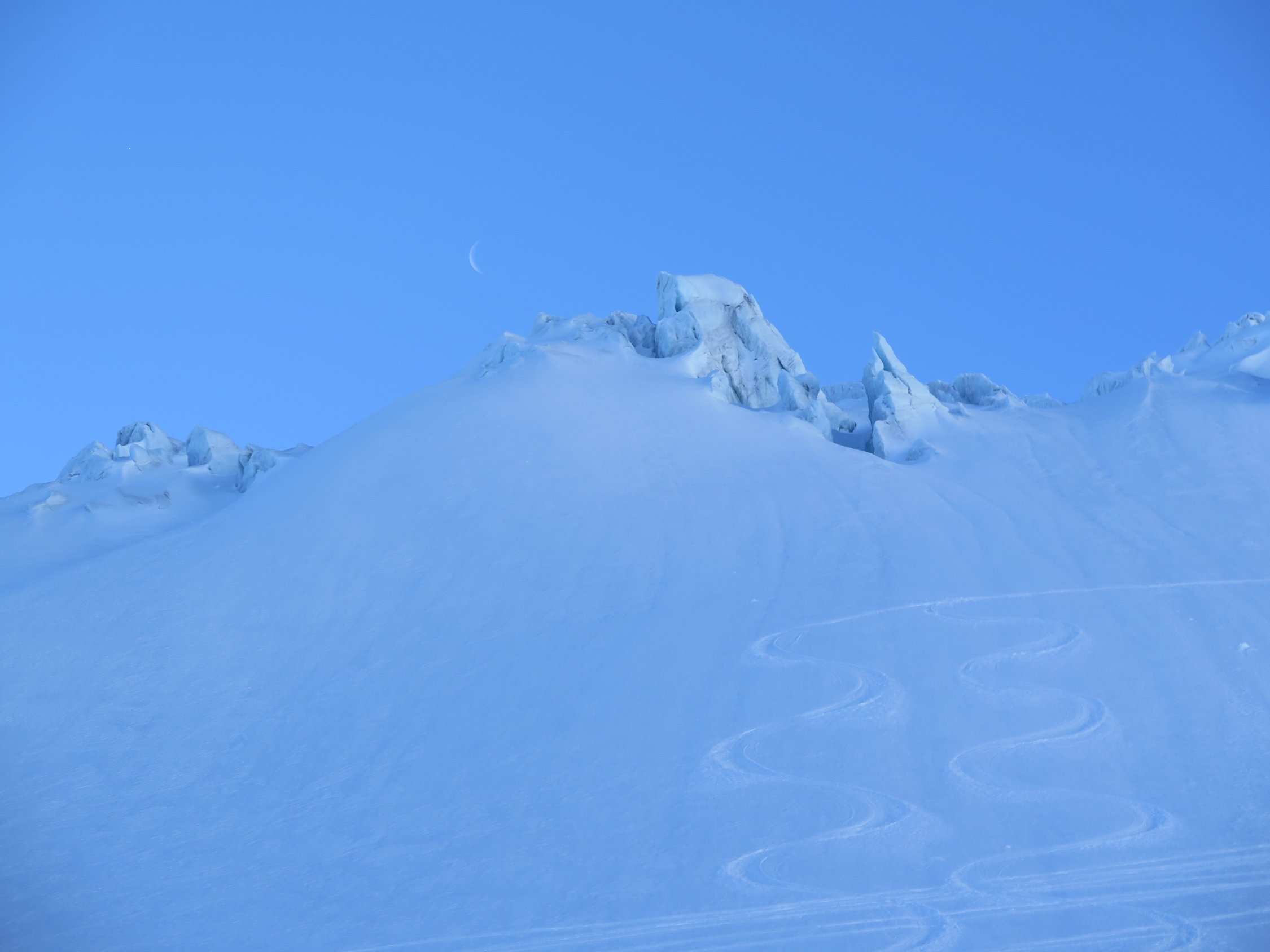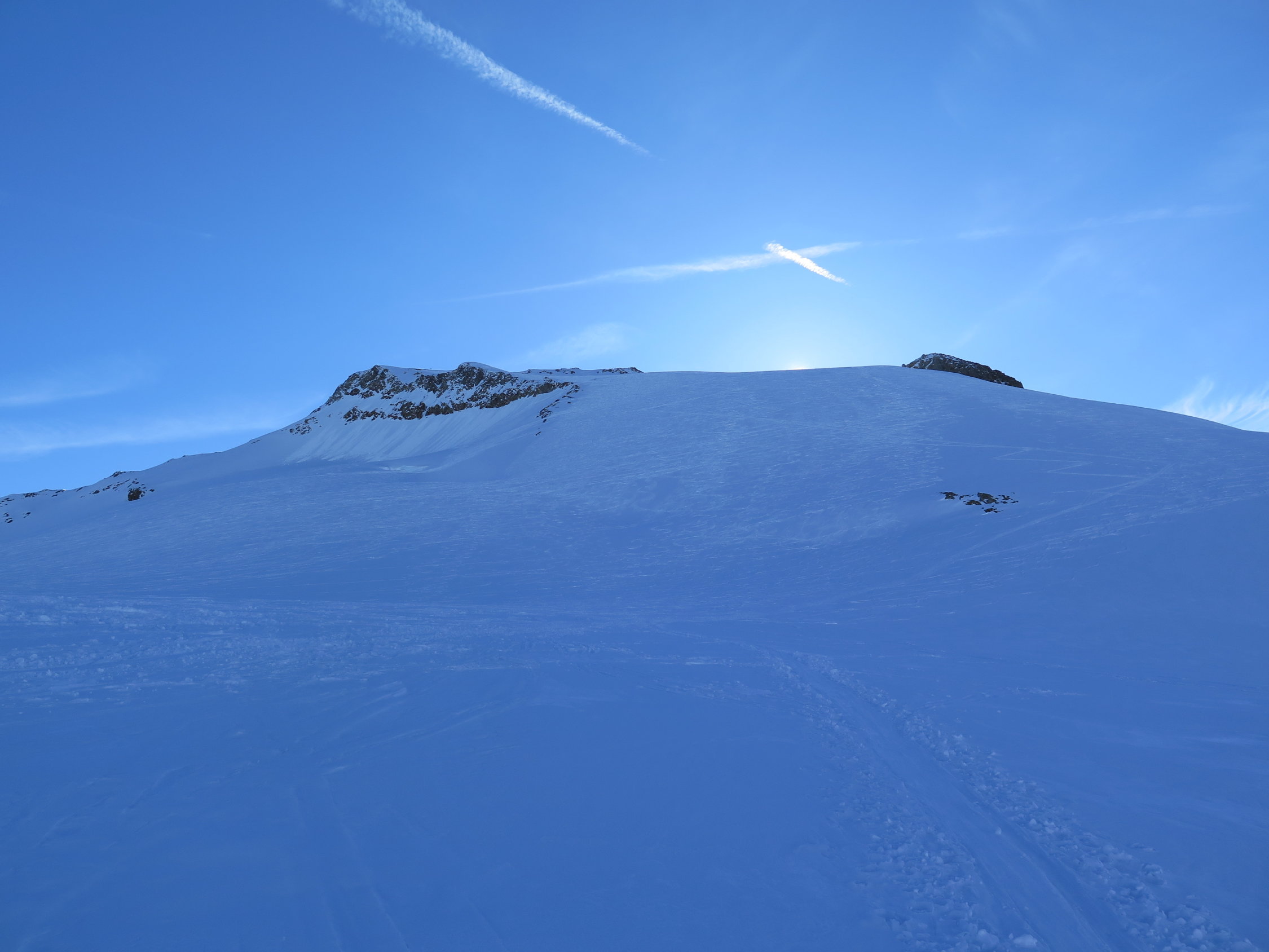 Am Gipfel wehte ein Kühler Luft. Nach 40 minütiger Gipfelrast hielt ich die kälte nicht mehr aus und fuhr bis unterhalb Gipfelhang. Dieser wahr um 10 Uhr immer noch Hart. Störend waren aber nur die vielen Tiefschneespuren von Samstag und Sonntag. Aber es hatte noch freie Stellen.