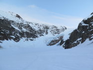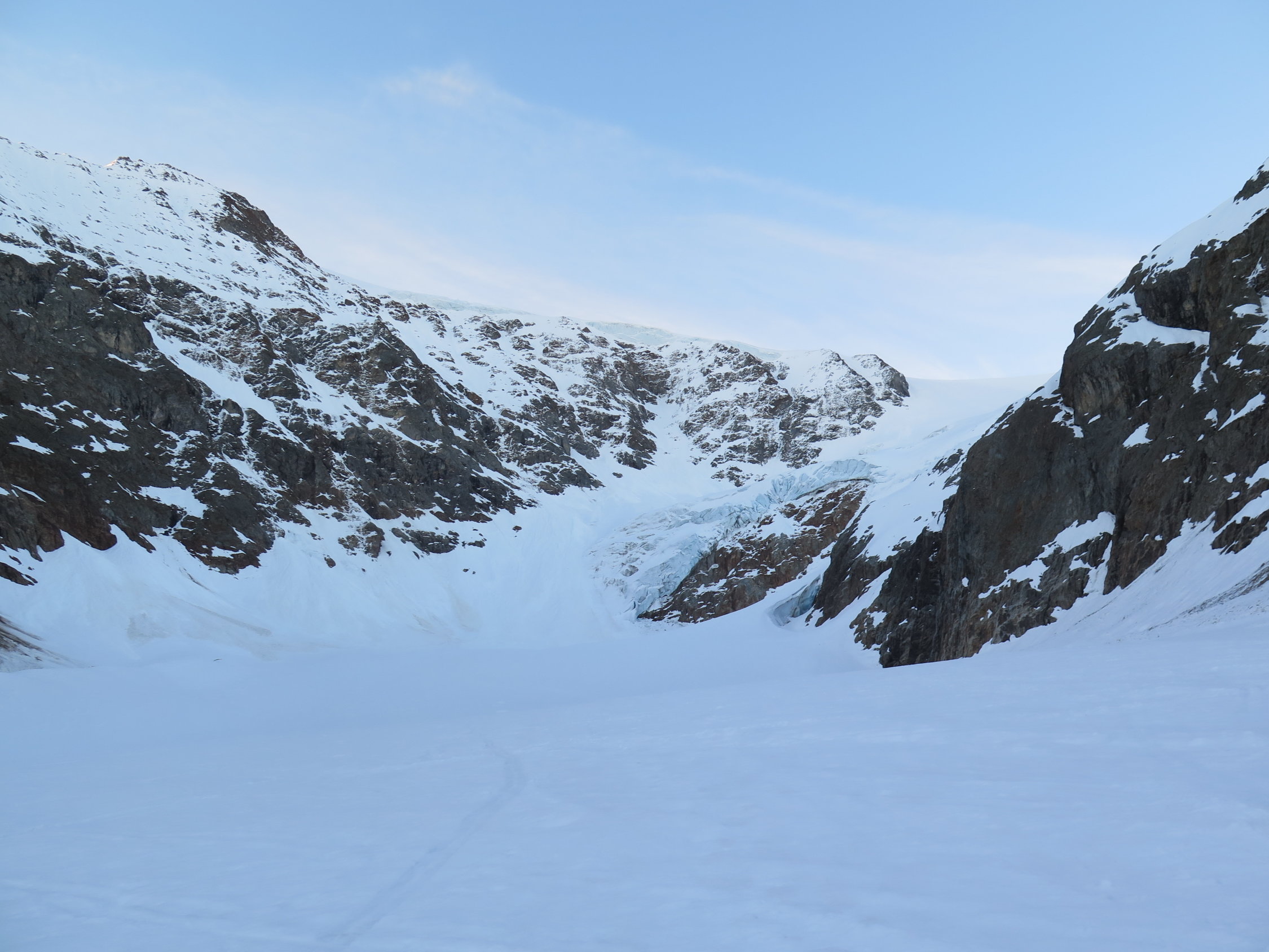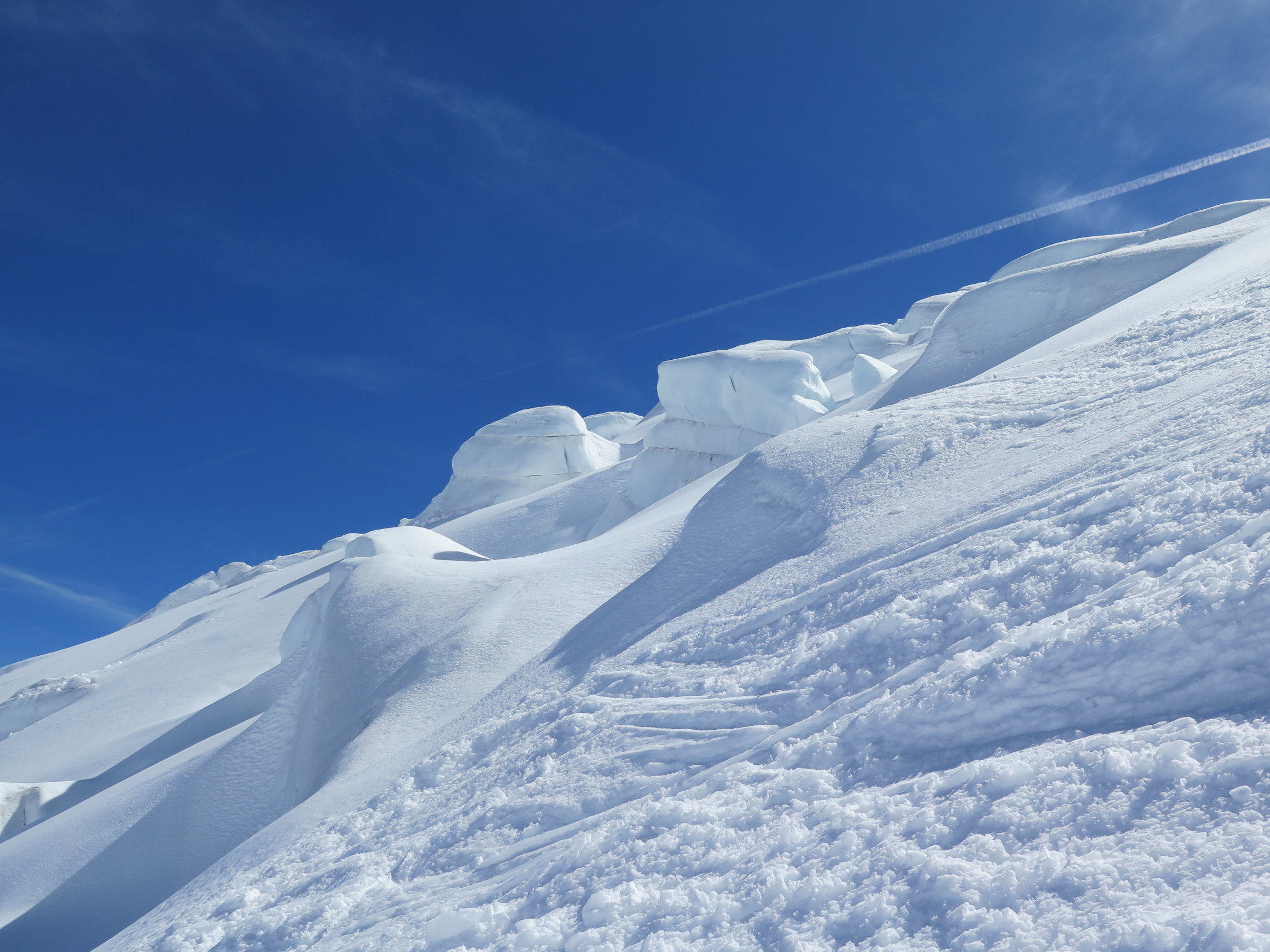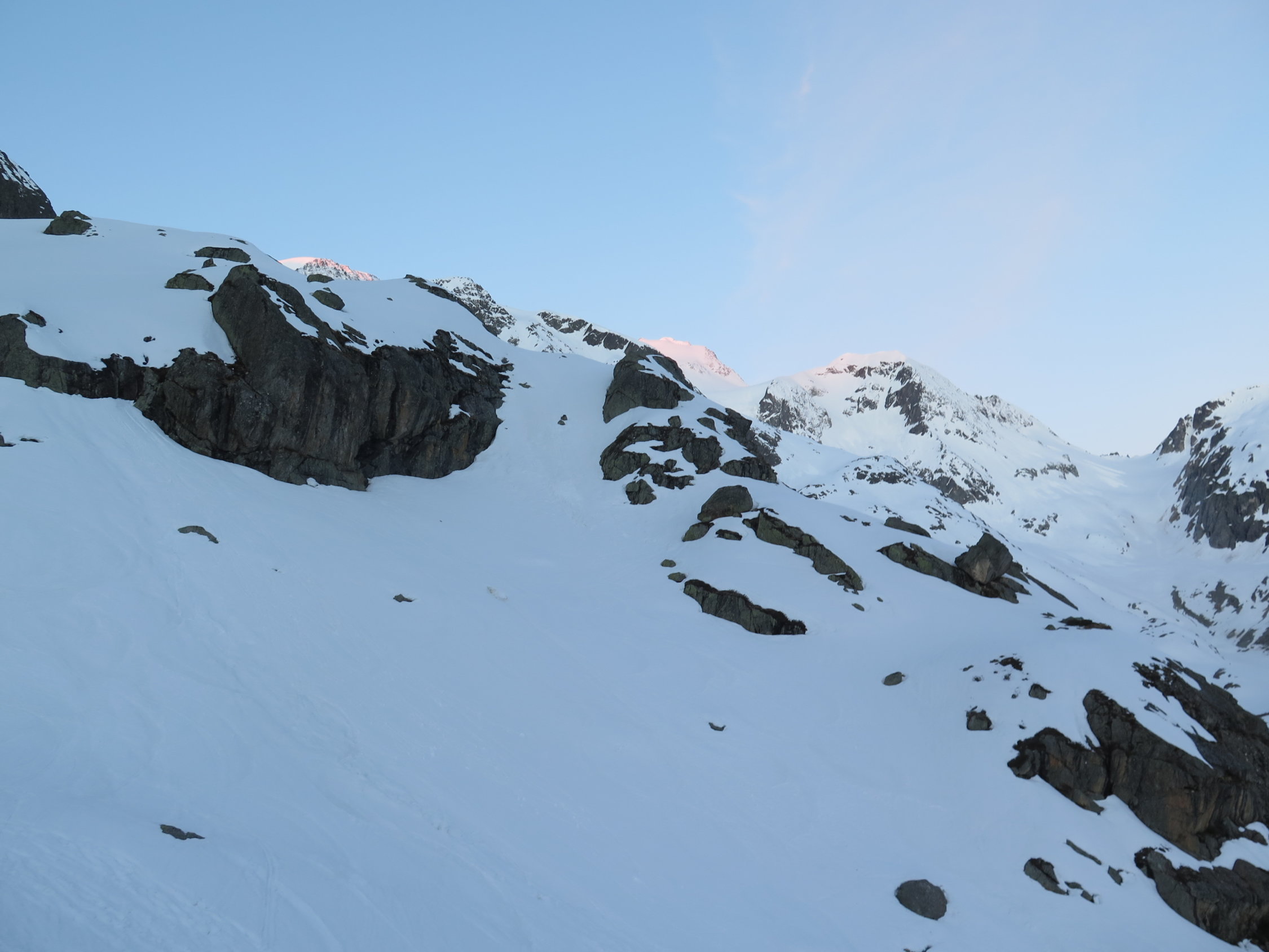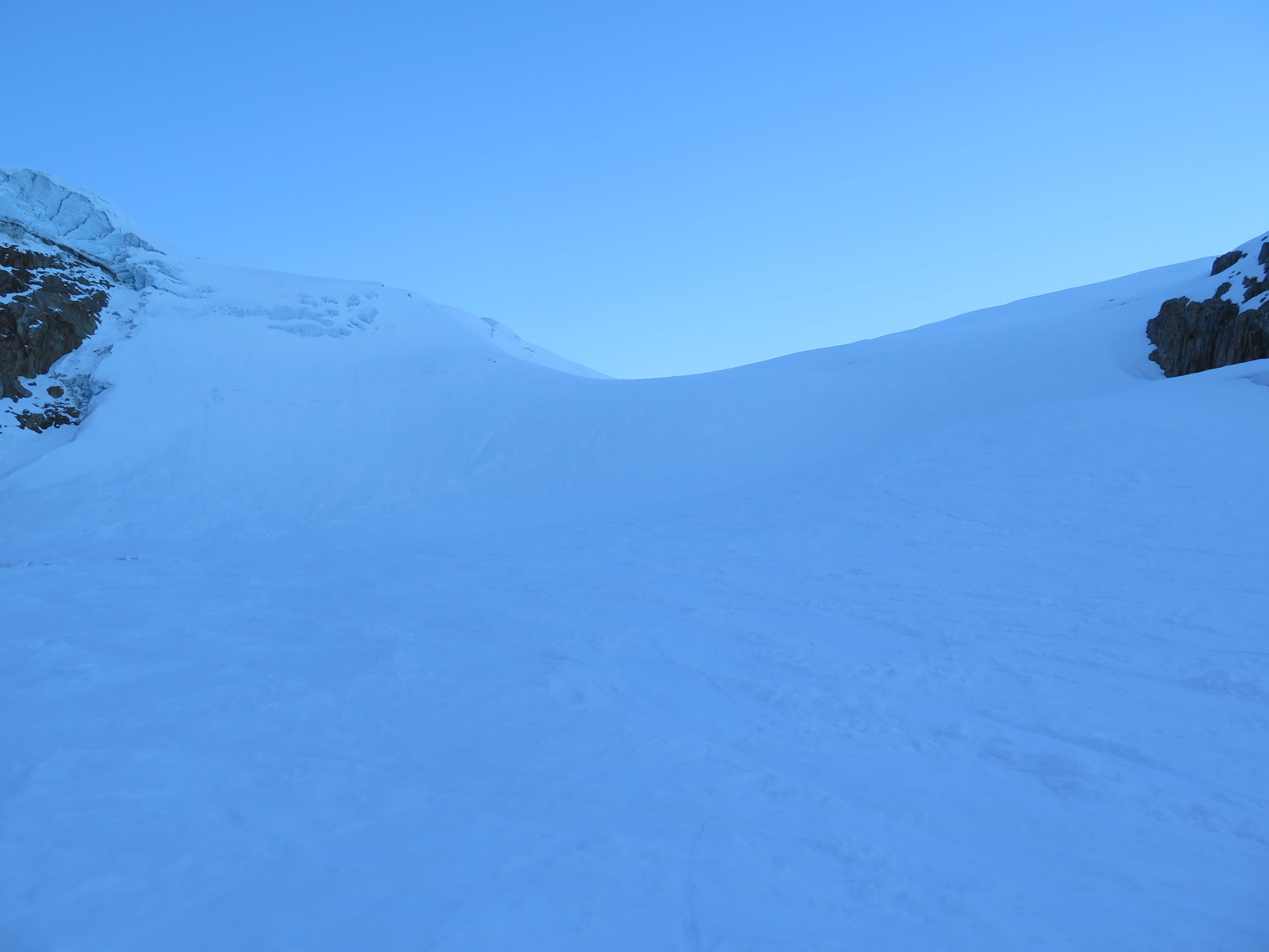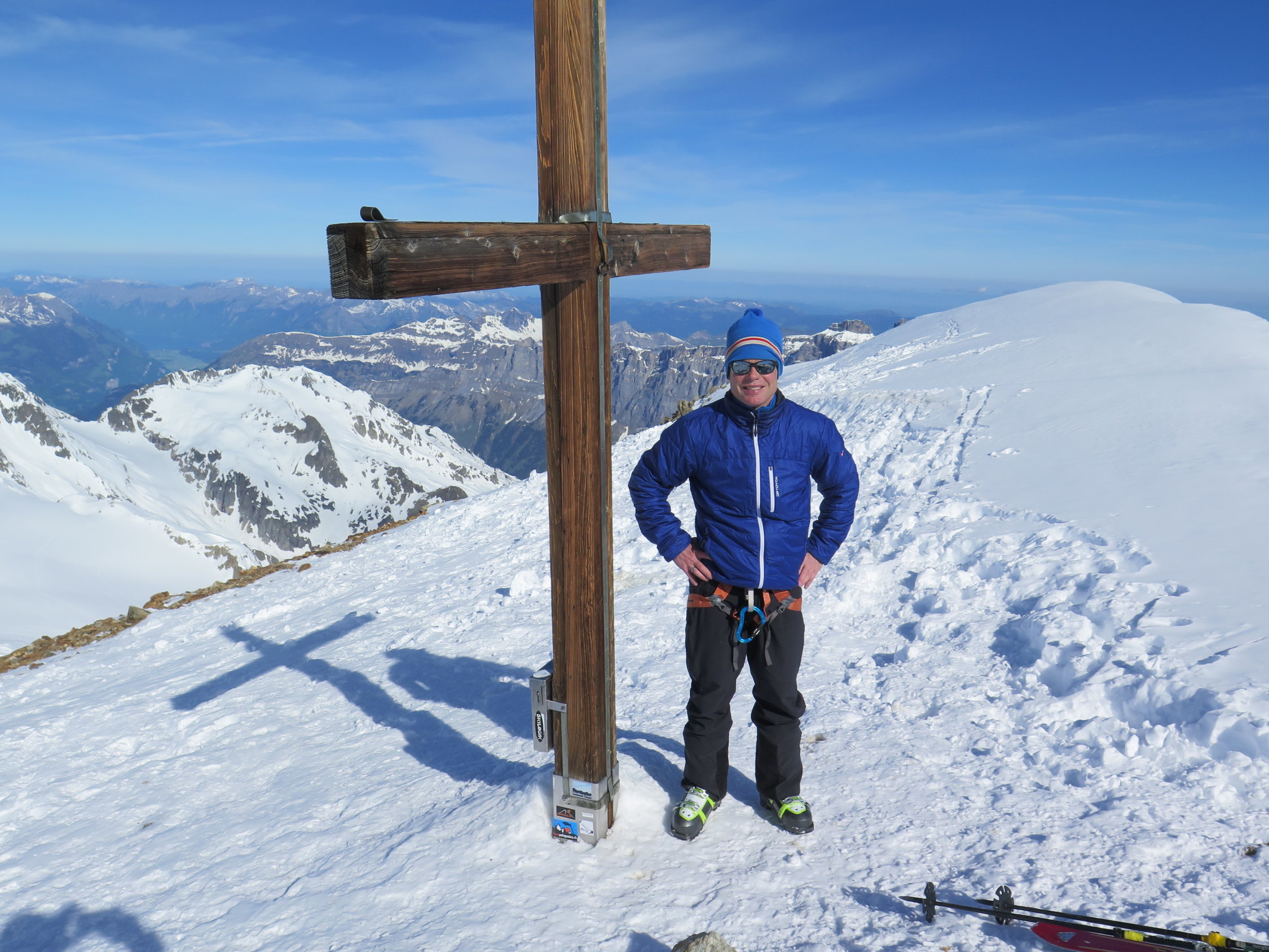Am Gipfel wehte ein Kühler Luft. Nach 40 minütiger Gipfelrast hielt ich die kälte nicht mehr aus und fuhr bis unterhalb Gipfelhang. Dieser wahr um 10 Uhr immer noch Hart. Störend waren aber nur die vielen Tiefschneespuren von Samstag und Sonntag. Aber es hatte noch freie Stellen.