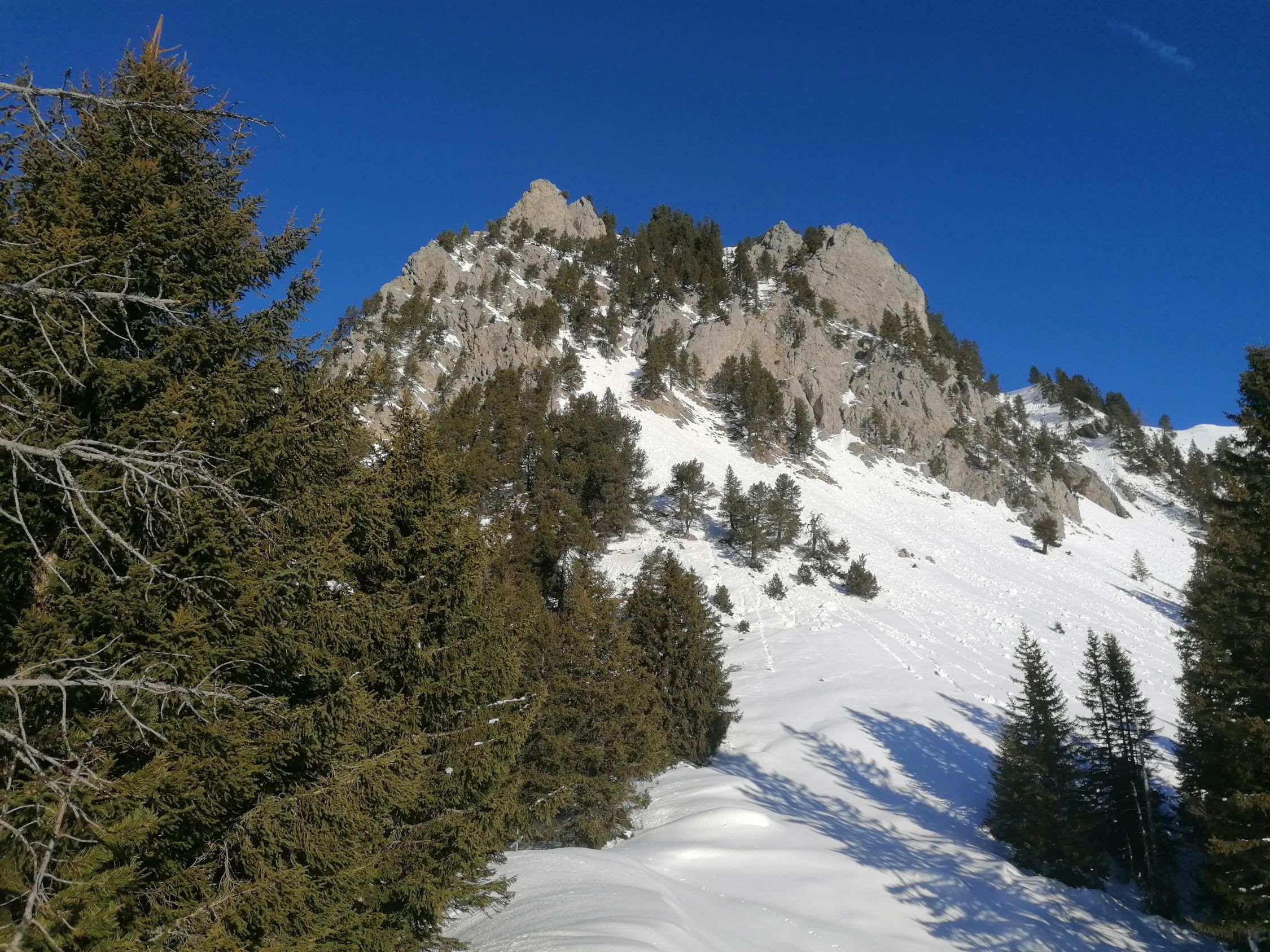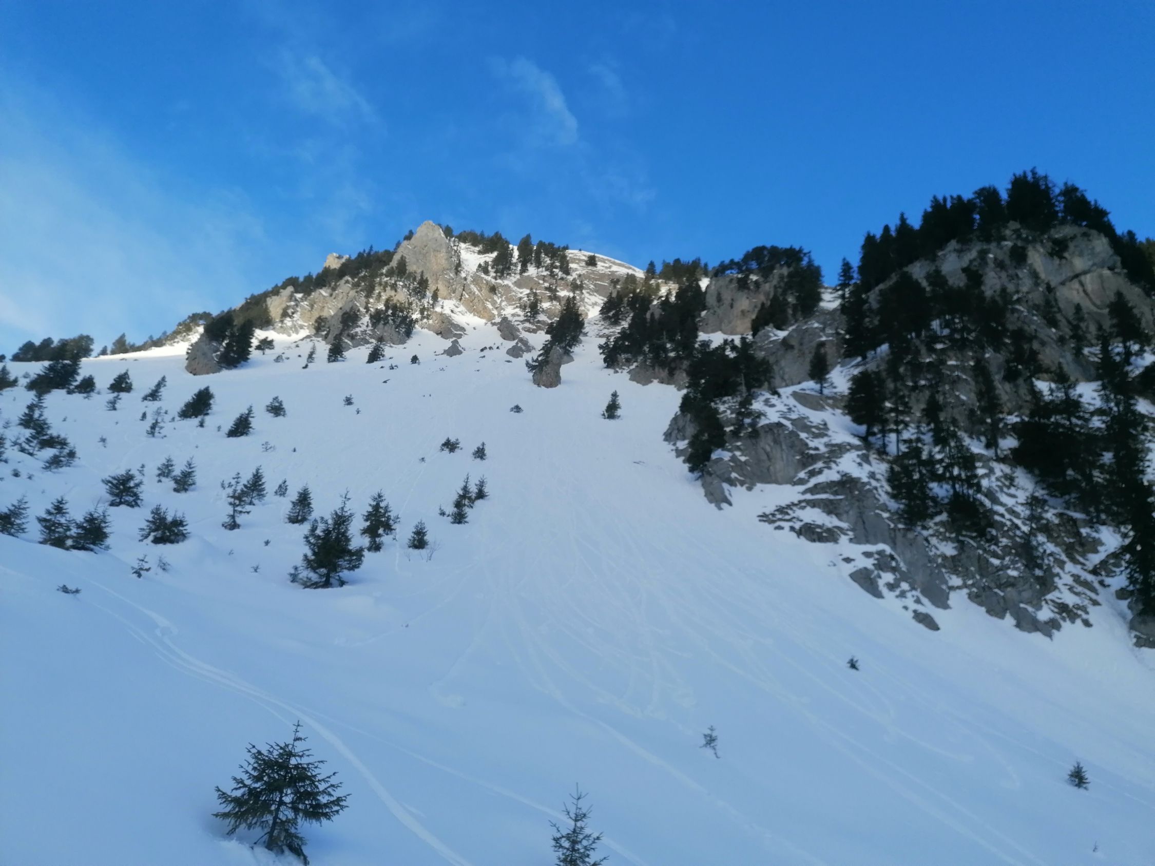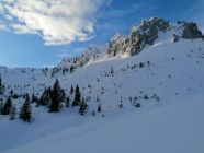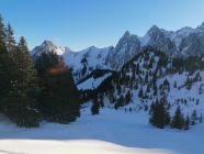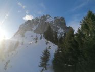 Diese wunderbare Skitour bietet eine spezielle Ambiente. Man hat im Angesicht dieser gewaltigen Kalkberge das Gefühl in den Dolomiten zu sein.