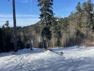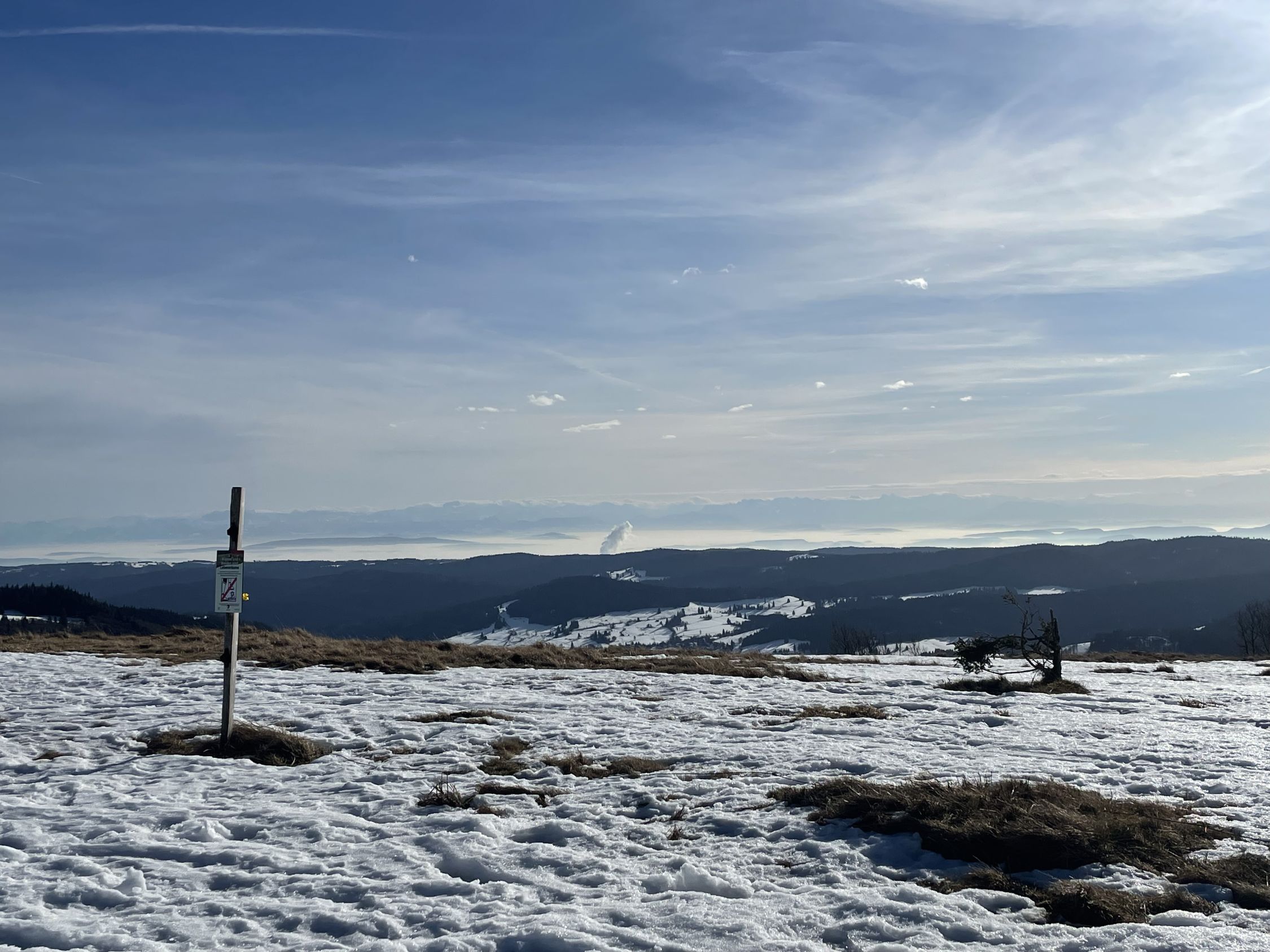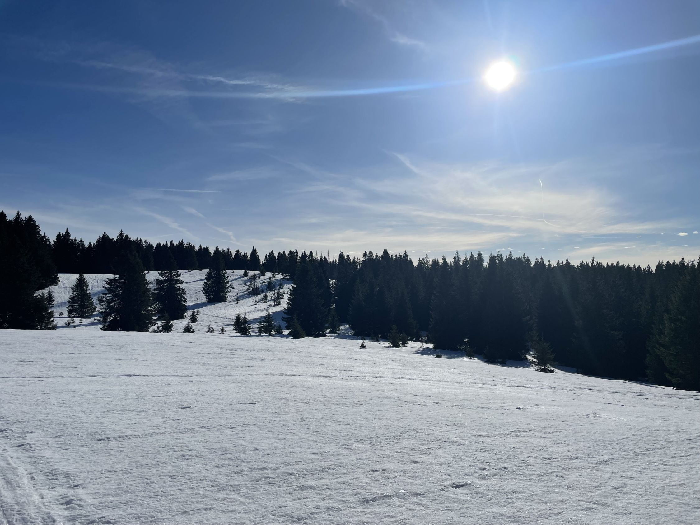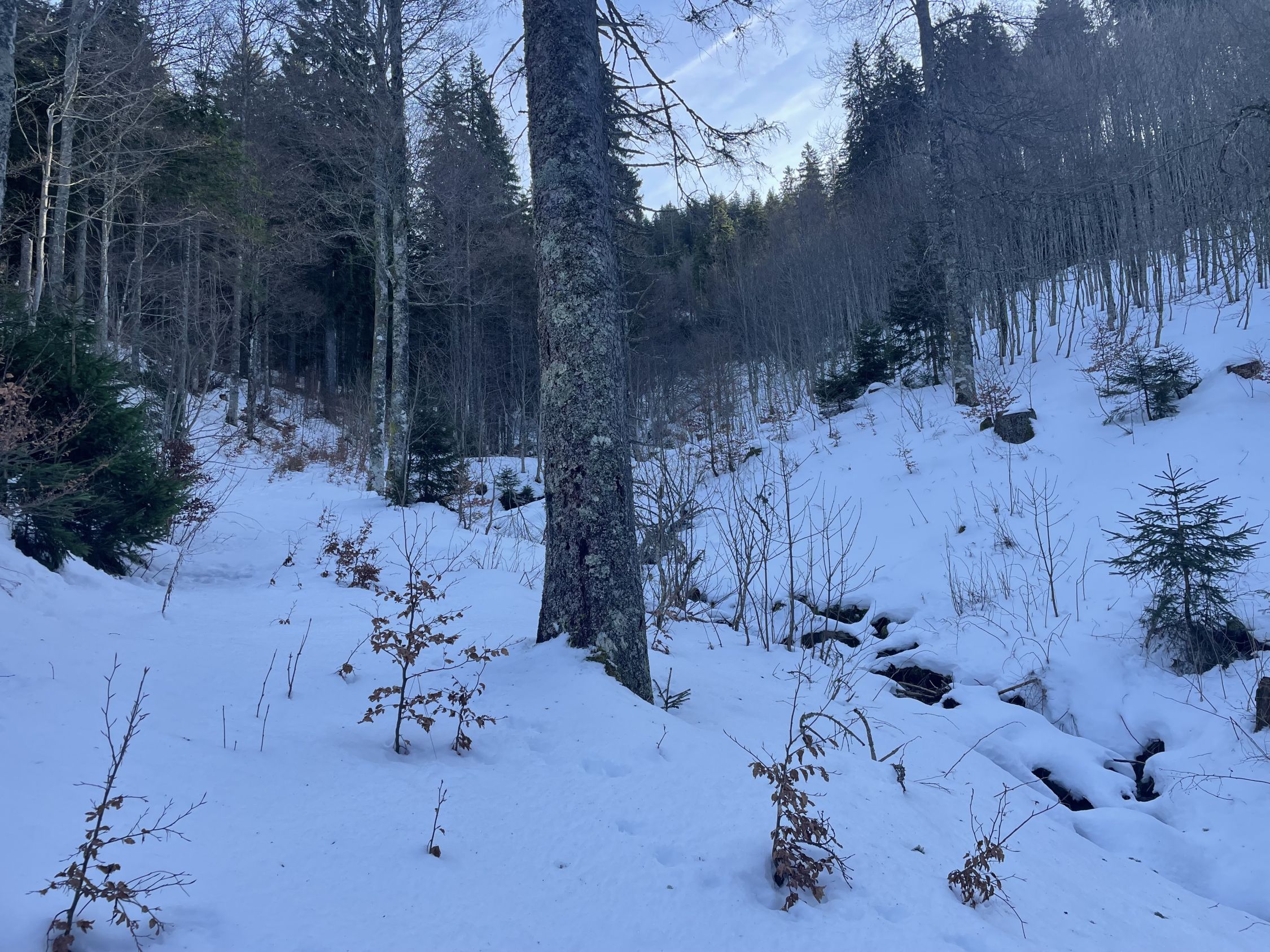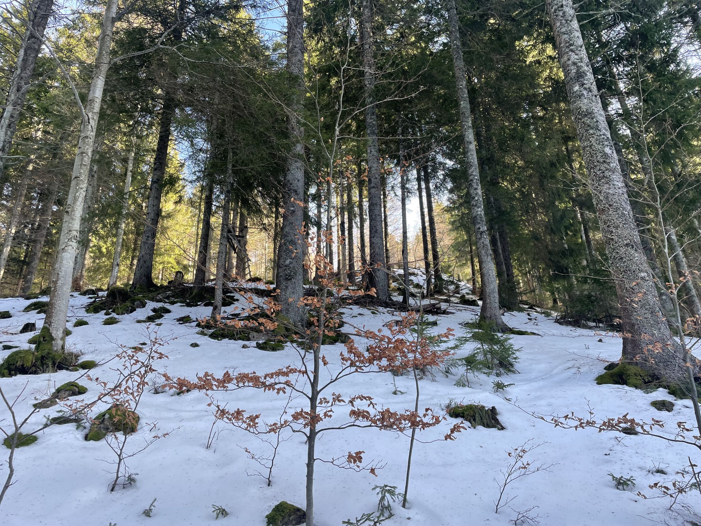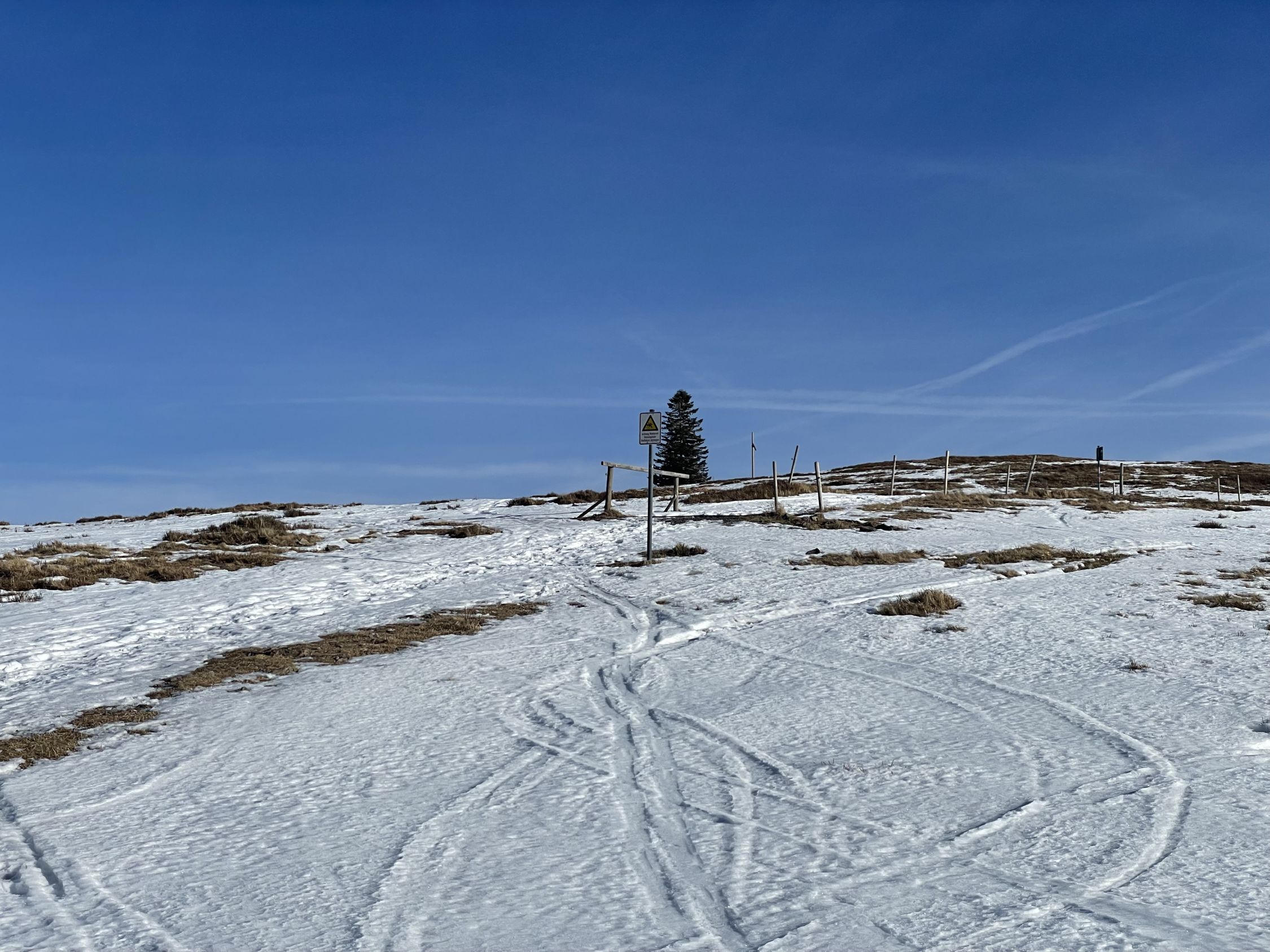 Es hat noch Schnee im Schwarzwald, südliche Hänge sulzen auf, nördliche hart tragend oder Bruchharsch, je nach Höhe.
