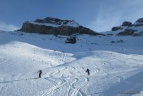 Abfahrt: Im Gipfelhang zuerst etwas Slalom um die Steinblöcke, aber keine Steinkontakt. Die obere Hälfte des Gipfelhangs war recht windgepresst. Etwas anspruchsvoll zu fahren. Unterhalb des Chalberstöcklis schöner, feuchter Pulverschnee in den Mulden. Bis zum Wald sehr schön zu fahren. Dann auf der harten Waldstrasse zurück zur Talstation.