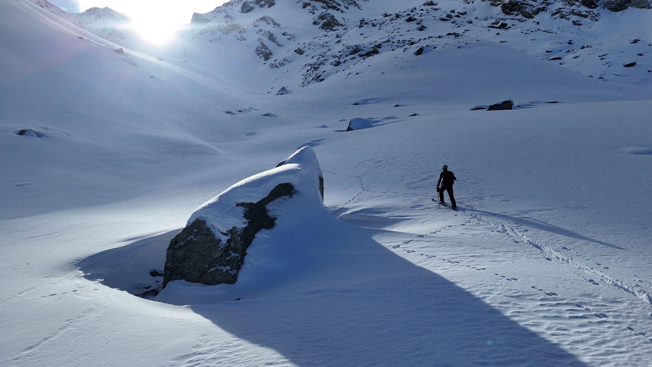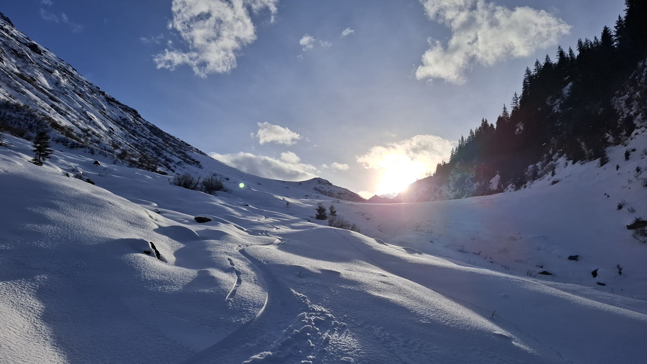 Ausgezeichnet auf das Gesamtpaket von heute. Wetter sehr gut, Schnee von 1500m bis 2400 Pulver, darüber ganz leichter Winddeckel, und unten Sulz.