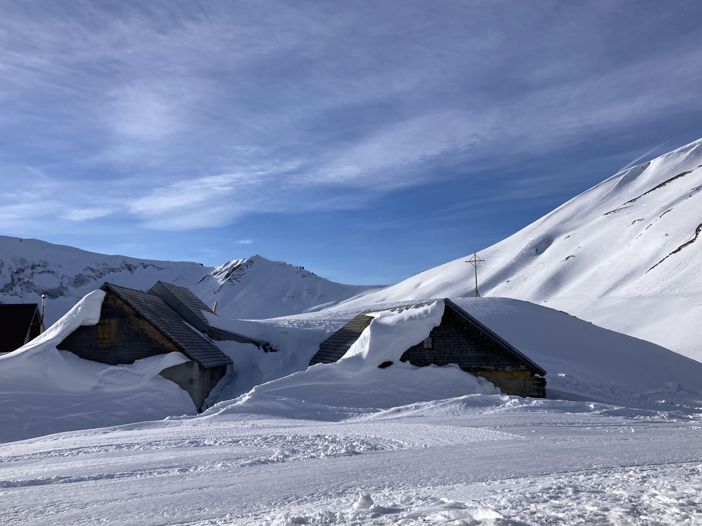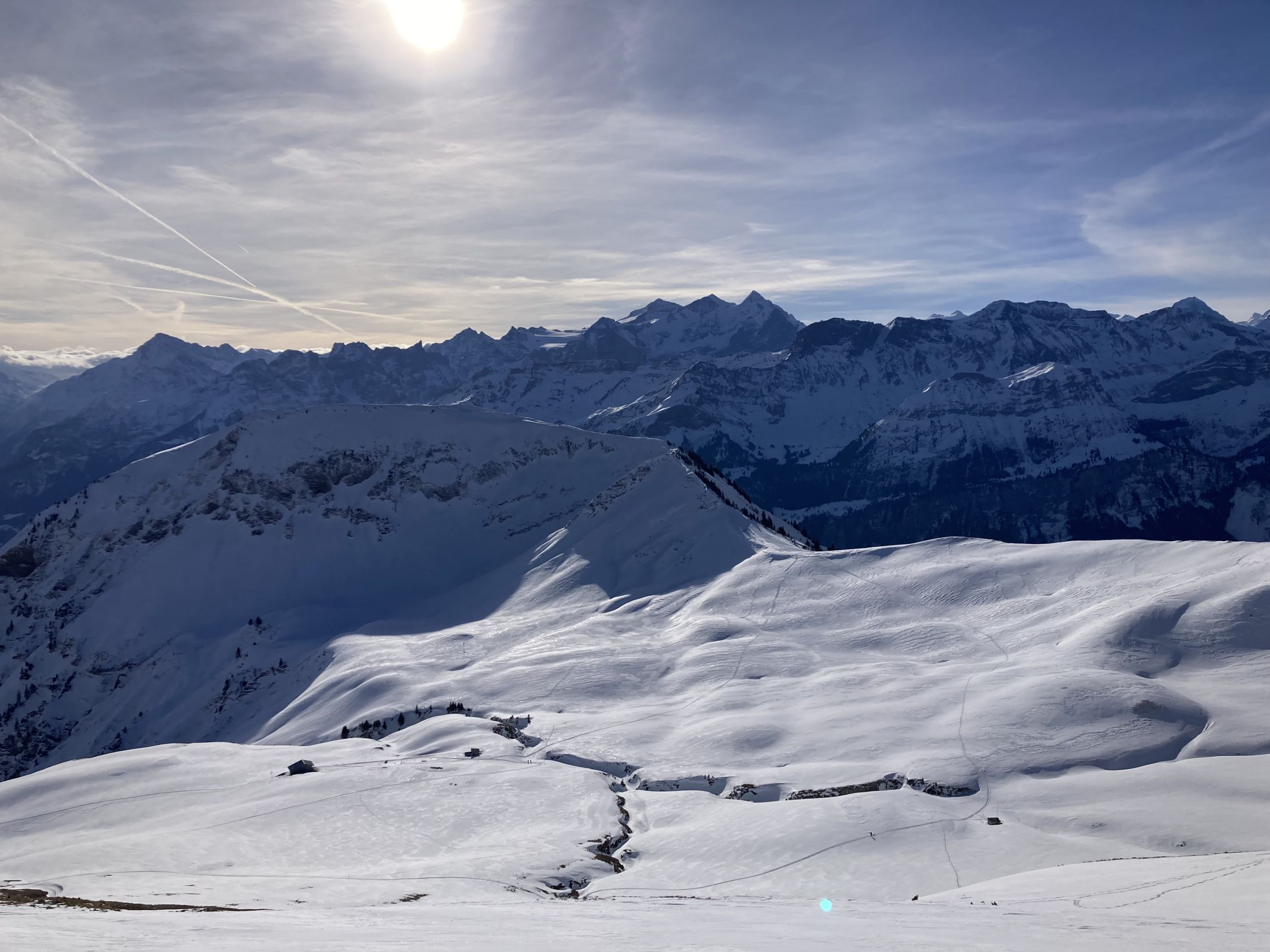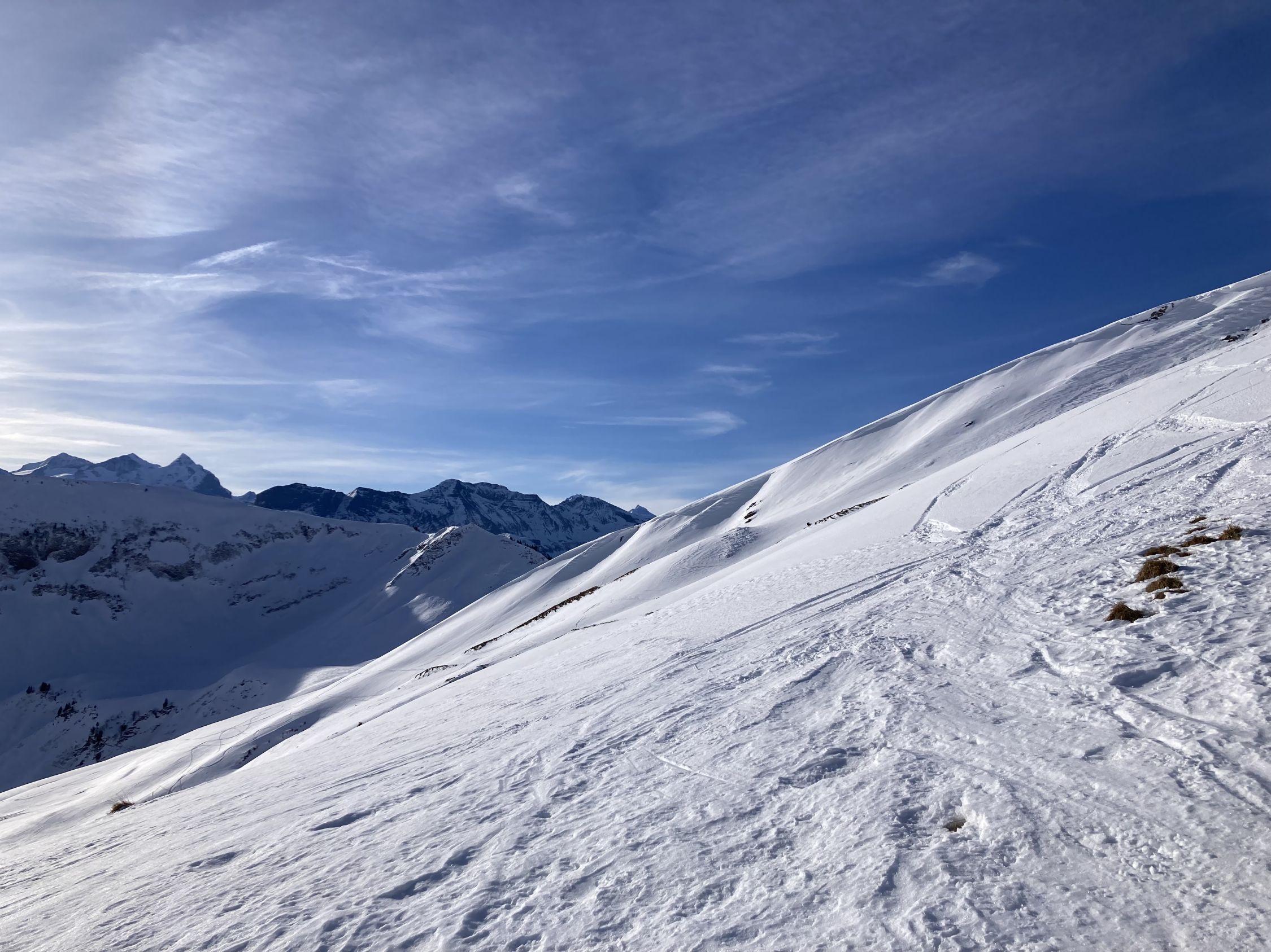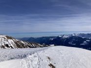 Immer wieder schön, auf dem Höch Gumme zu stehen. Das Panorama ist ganz einfach umwerfend. Heute sowieso; bei dem Föhnsturm war Standhaftigkeit gefragt. Die Abfahrt ging heute problemlos, trotz der vielen Spuren.