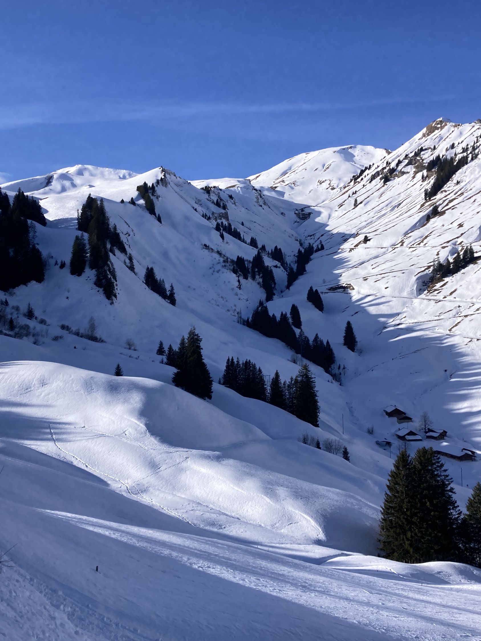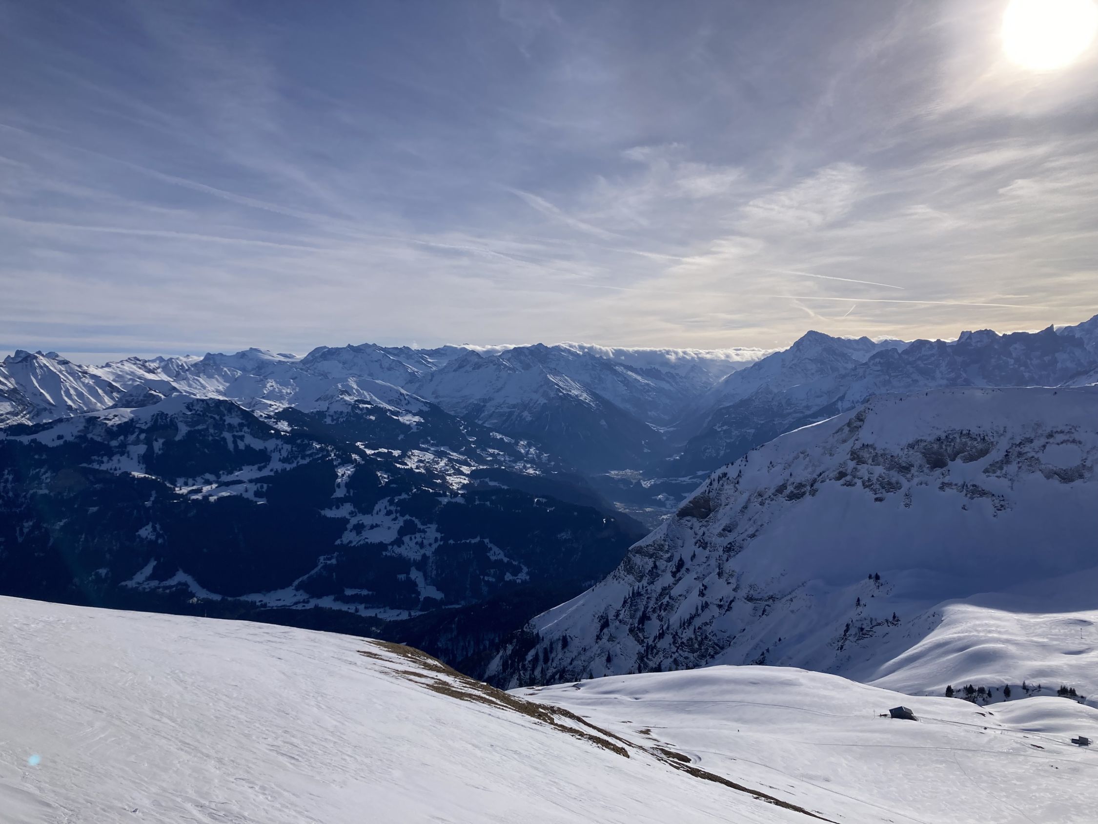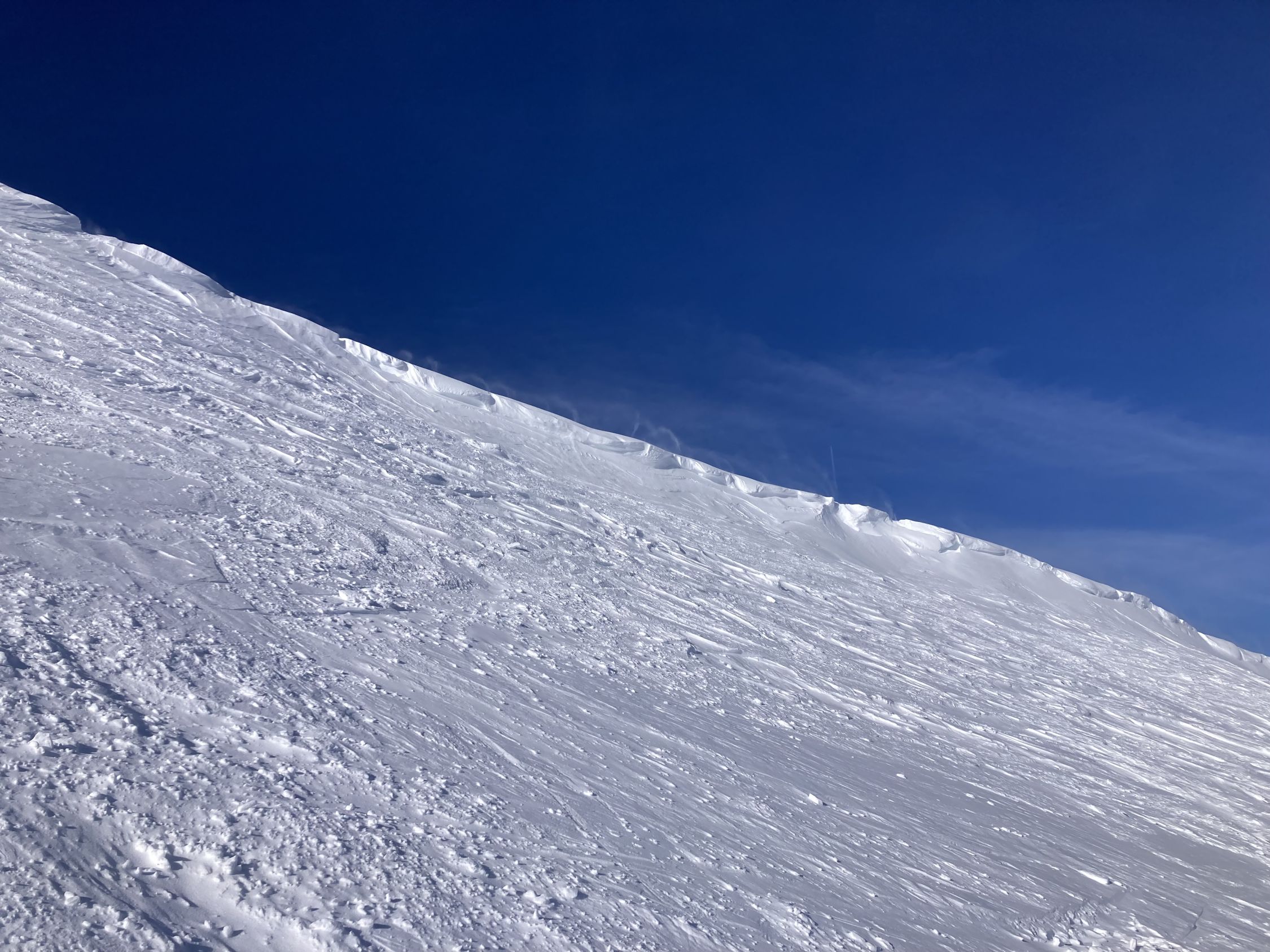 Immer wieder schön, auf dem Höch Gumme zu stehen. Das Panorama ist ganz einfach umwerfend. Heute sowieso; bei dem Föhnsturm war Standhaftigkeit gefragt. Die Abfahrt ging heute problemlos, trotz der vielen Spuren.