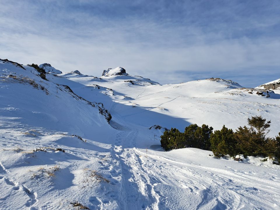 Ein paar Überraschungen heute, mehr Schneeschuhgänger (bis unter bzw auf Margelkopf) als Skitourer, viel Südwind (Föhn) auf Drittel der Strecke, oben fast windstill und angenehm, Abfahrt überraschend gut..