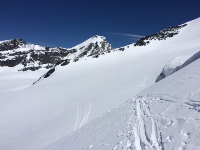 Tipp: Vom Allalinpass entweder gar nicht aufsteigen und unterhalb des ersten Sporns auf ca 3540m durch. Oder leicht aufsteigen und oberhalb des Sporns auf ca 3650m durch, da hats eine kurze steile Schneepassage am Rücken, wir haben dort auf dem Rückweg die Skis ca 10m getragen. Auf dem Hinweg sind wir unten durch, was einfacher aber weiter ist.
