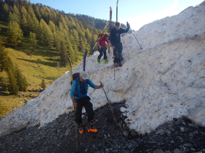Ab Iffigenalp noch ein Stück zu Fuß bis ca. 1750m, von da ab durchgehend Schnee, mit nur zwei , wenige Meter langen Tragestellen bis zum Iffigensee. See links über gute Spur umgangen, über den See geht nicht mehr, das Eis ist schon sumpfig. Während man unterhalb des Sees bei der Abfahrt schon etwas auf erste Steine achten muss, gibt es oberhalb des Sees bis zum Gipfel noch sehr viel Schnee.