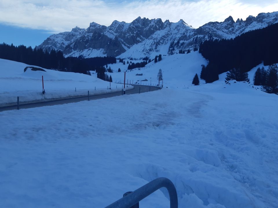 Leicht föhnig , im Schatten dünner Bruchharst der sich drücken lässt an den Sonnenhängen Sulz der sich gut fahren lässt an der Sonne lassen sich die alten Spuren gut durch pflegen am Schatten zum Teil noch Hart gegen Stein hinunter apere Stellen die sich umfahren lassen