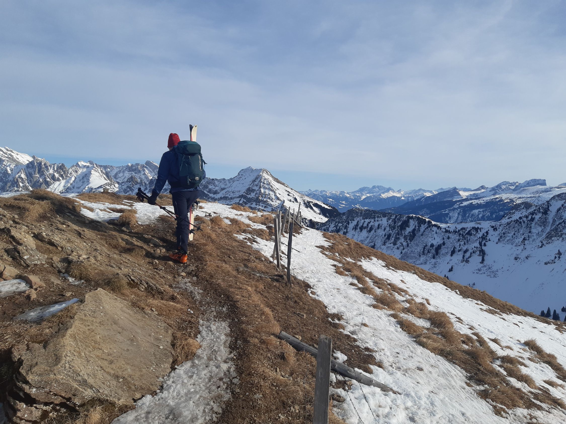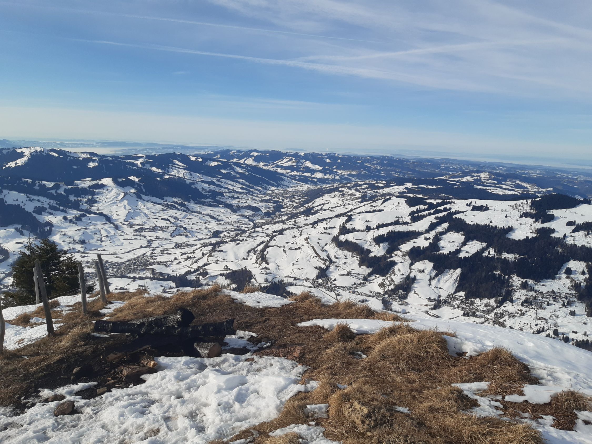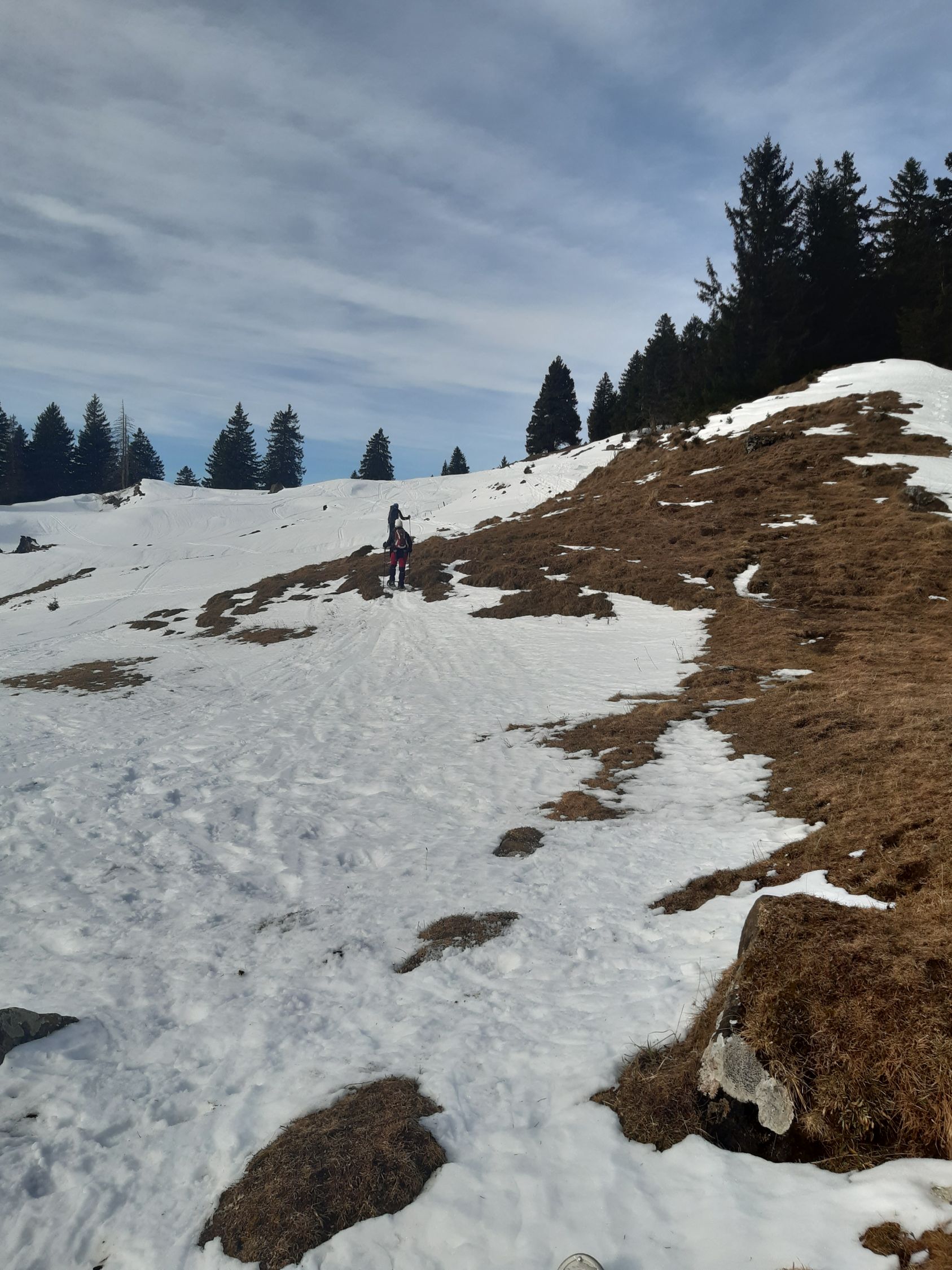 Leicht föhnig , im Schatten dünner Bruchharst der sich drücken lässt an den Sonnenhängen Sulz der sich gut fahren lässt an der Sonne lassen sich die alten Spuren gut durch pflegen am Schatten zum Teil noch Hart gegen Stein hinunter apere Stellen die sich umfahren lassen