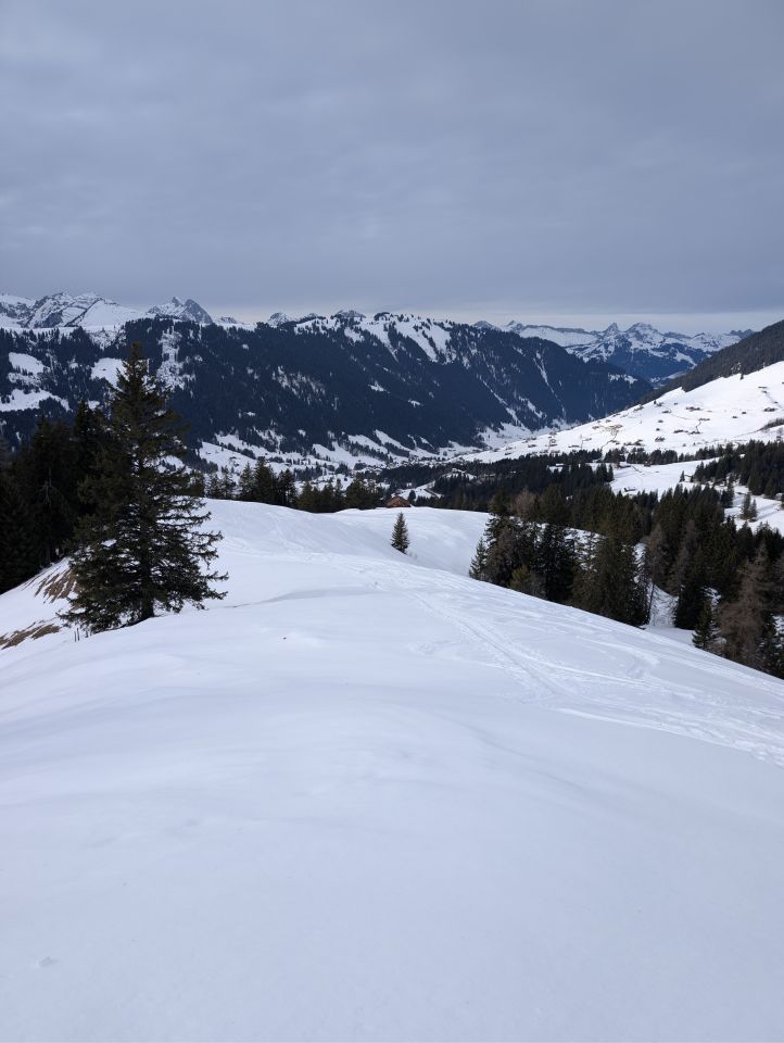 Abfahrt nach Nordwesten über Mitteltosse und Wolfegg. Zwischen 1700 und 1500 m Pulverschnee, darunter Bruchharsch bis ins Tal.
