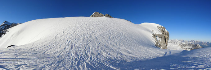 Danach in der Flanke bester Firn, hart und tragend. Die kurze Querung in der Nordseite war auch Firn noch gefroren und tragend so war es auch bis zum Gipfel.
