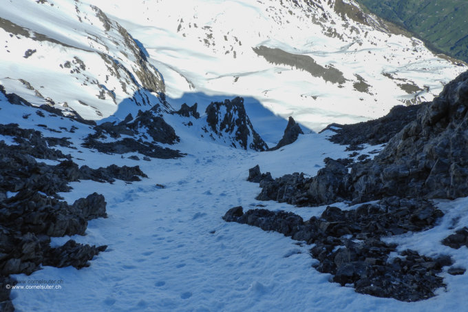 Die Schlüsselstelle wird mit der Wärme mehr und mehr ausapern, nur noch wenige Tage machbar. Danach ist es besser via Lücke im Chammli-Südgrat Pt.2974 auf dem Südgrat hinauf zum Chammliberg, oder evtl die Überschreitung ab Chammlijoch, Chammliberg Ostgipfel – Hauptgipfel – Südgrat.