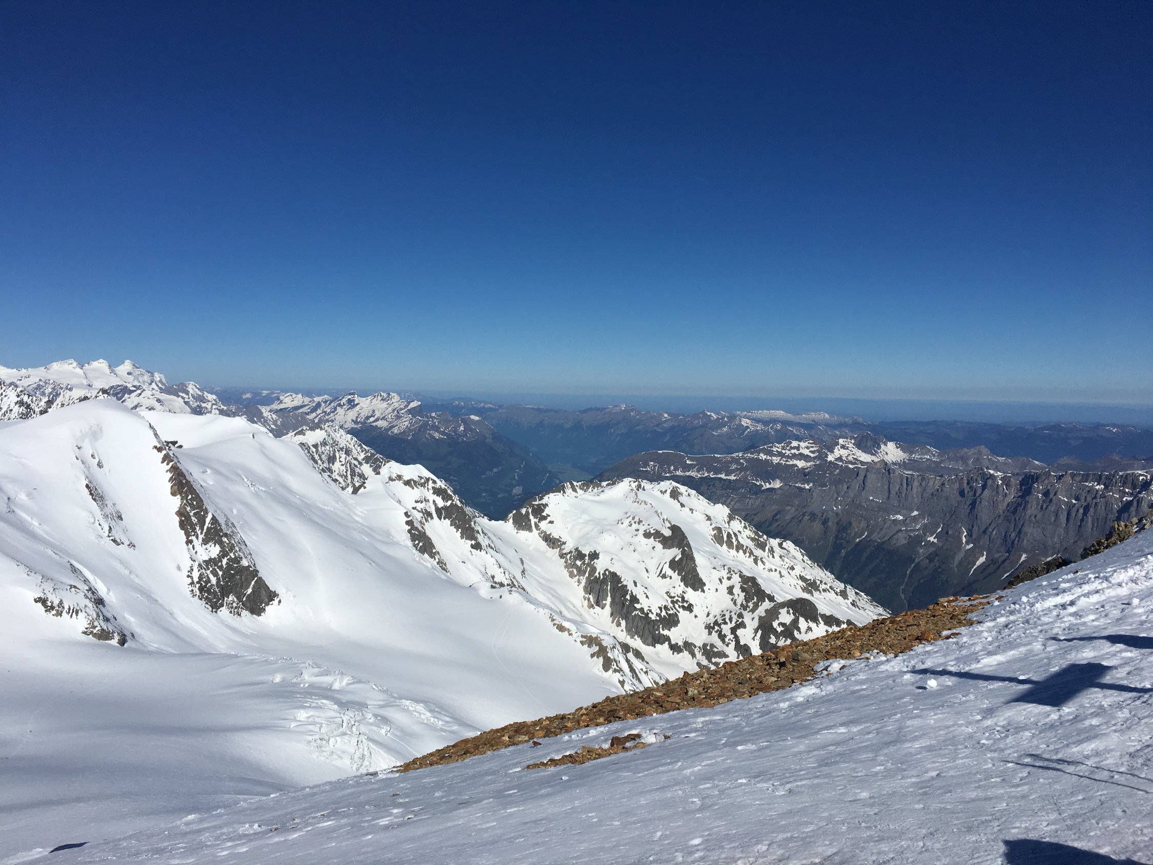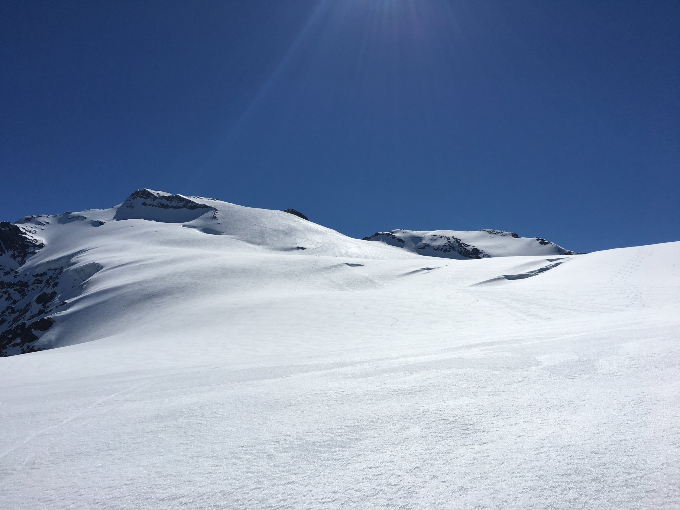 Am Morgen gefroren und gut zu gehen. Abfahrt Gipfel um 0945 Uhr. Die ersten 500 hm noch hart, dann in sulz übergehend und zu unterst dann nasser Schnee.