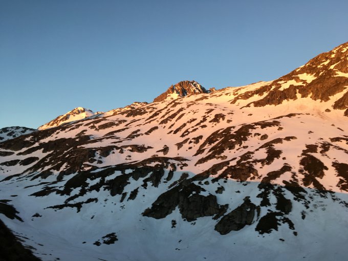 Um 5:00 los, knapp 10 min Laufen ab den Alphütten Milex. Bald Sonne da der Zustieg grösstenteils über Osthänge verläuft. Aufstieg über Tomasee. Zum Laufen eigentlich gut da nicht sehr hart. Überschreitung des Gipfels und Abfahrt um 09:15 über Plauncas Badus. Bis ca 2500 sehr schön, danach Surf- und Bremsschnee bei diesen Temperaturen.