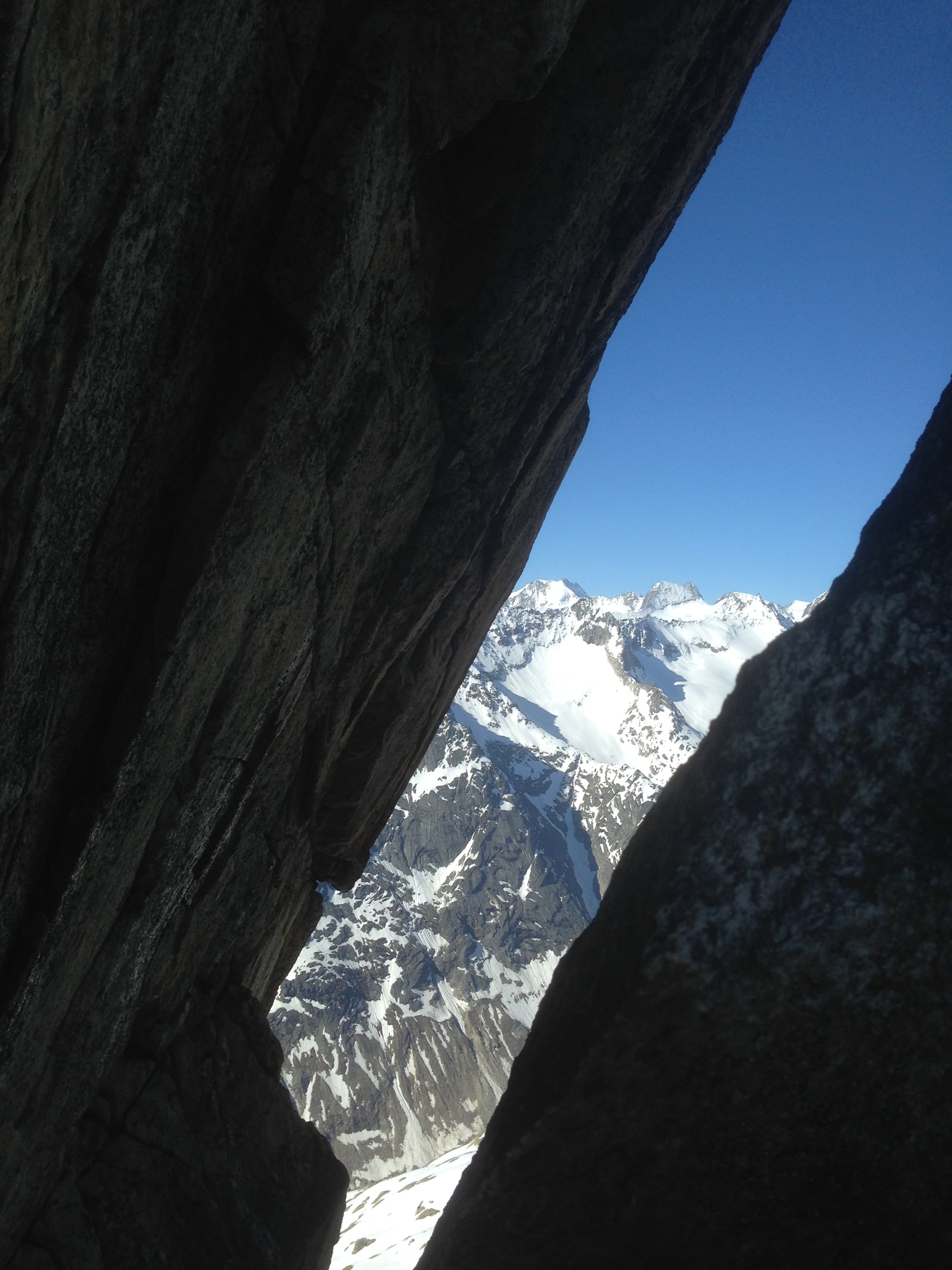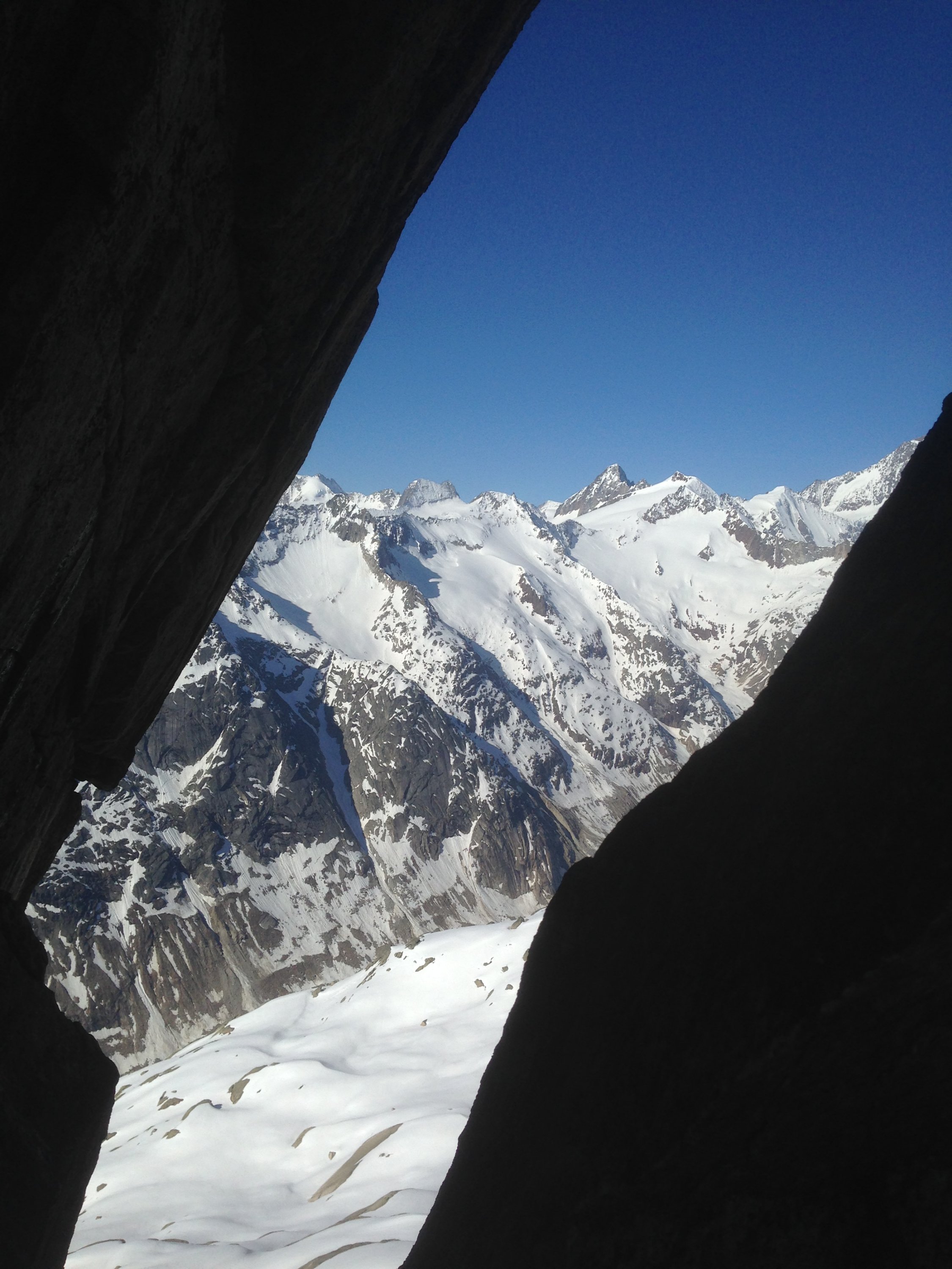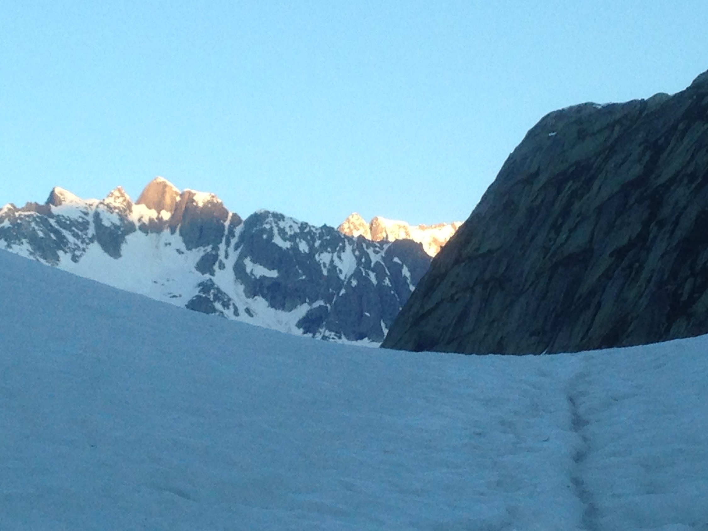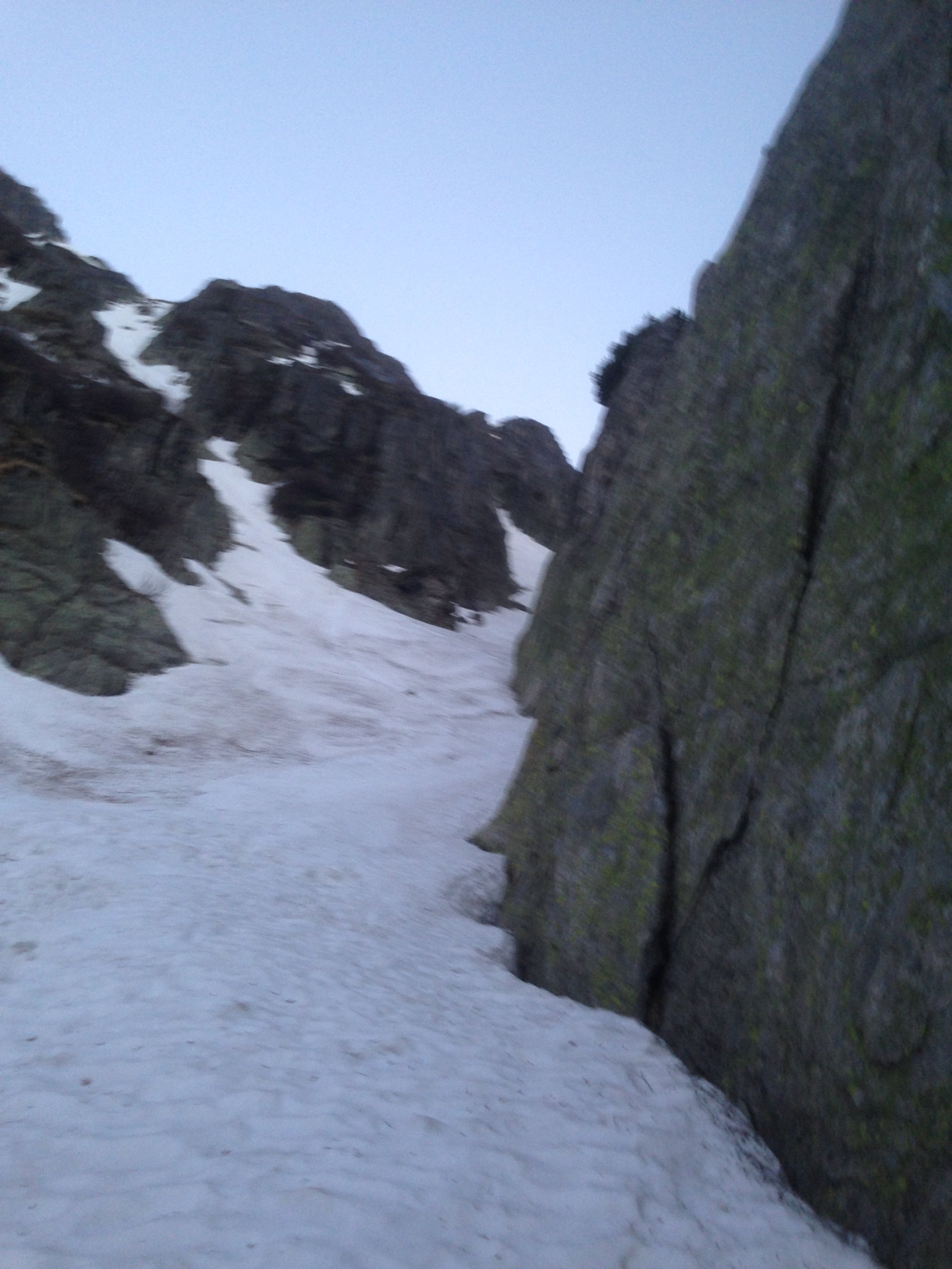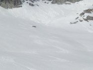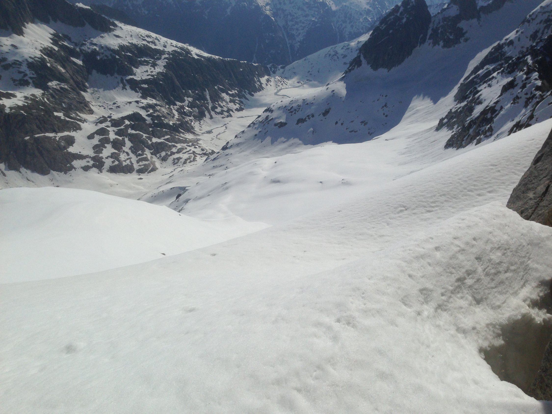 Die Osthänge unter dem Couloir sind aber den ersten Sonnenstrahlen ausgesetzt und darum schon früh aufgeweicht. Das Ostcouloir ist auch nicht mehr ganz durchgängig eingescheit. Darum und auch weil ich alleine unterwegs war habe ich nur die Brandlammenlicke bestiegen.