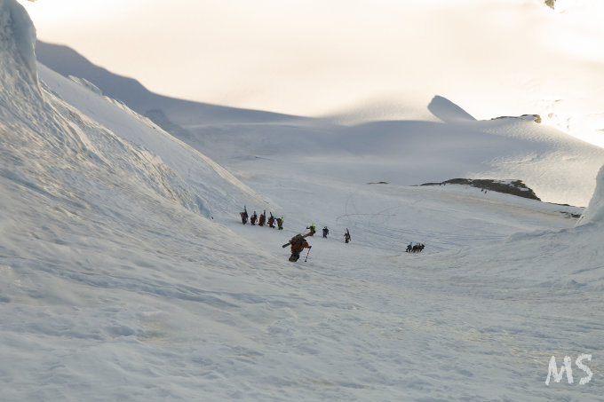 Gipfeltag: Wir sind ca 3.00 Uhr gestartet. Der Gletscher ist gut eingeschneit.