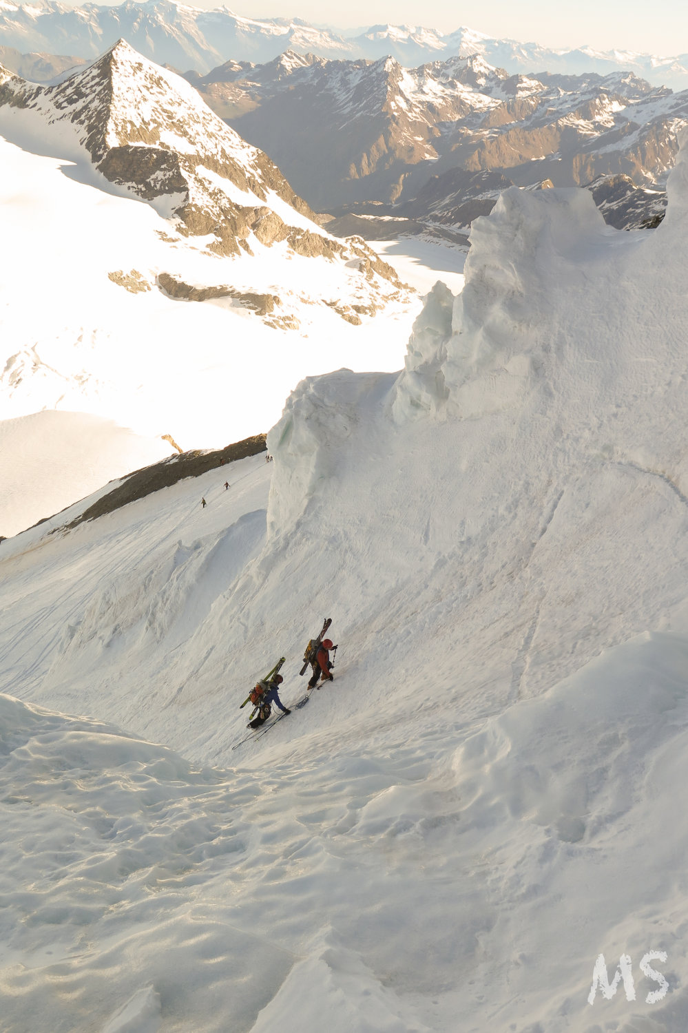 Mur de la Cote: Gute Spur, auf mehreren Metern unangenehm und heikel. (eine Gruppe nach uns hat am eingerichteten T-Anker abgeseilt. Ein paar sind mit den Ski abgefahren oder etwas abenteuerlich runtergerutscht)
