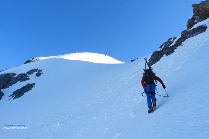 Im Couloir sehr gute Verhältnisse, bester Firnschnee, hart, tragend, die Steigeisen bieten besten halt.