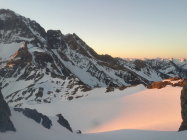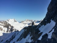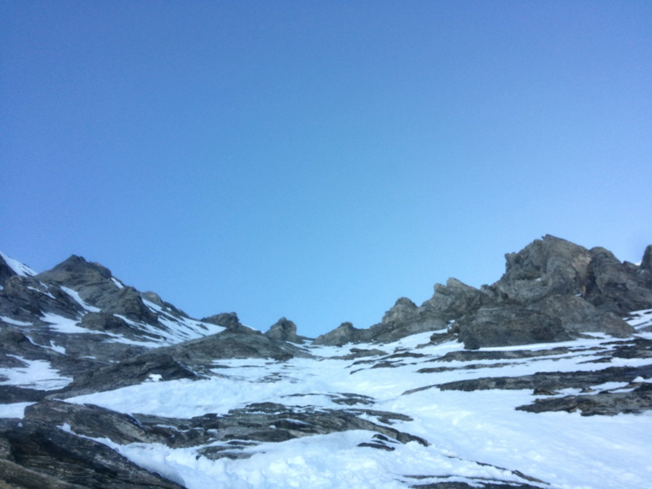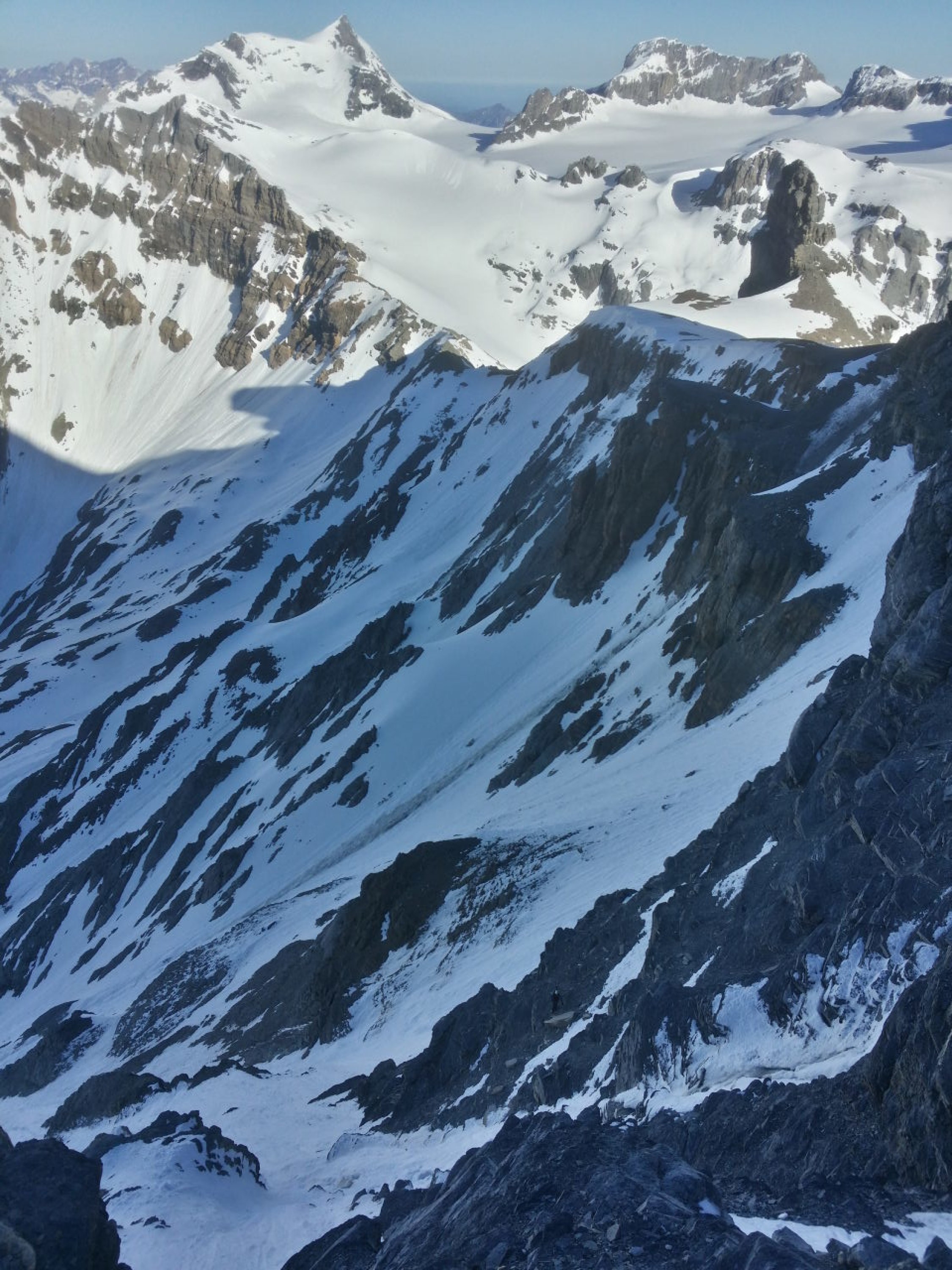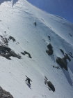 Ideale Verhältnisse! Der Neuschnee von letzter Woche ist als ca. 30 cm dickes Schneebrett über die ganze Wand abgerutscht (Anrisskante etwas unterhalb der vier Türme). Die Altschneeschicht darunter ist hart und griffig, aber nicht eisig. Traverse ebenfalls in sehr gutem Zustand; 5 m Blankeistraverse.