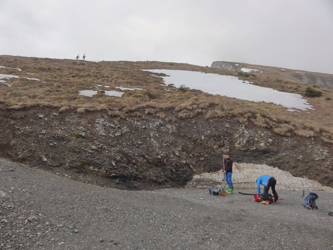 Vom Gemsfairenjoch auf den Claridenfirn hat sich die oberste Schneeschicht von gut 10cm unterhalb der Skier gelöst und ist abgerutscht.