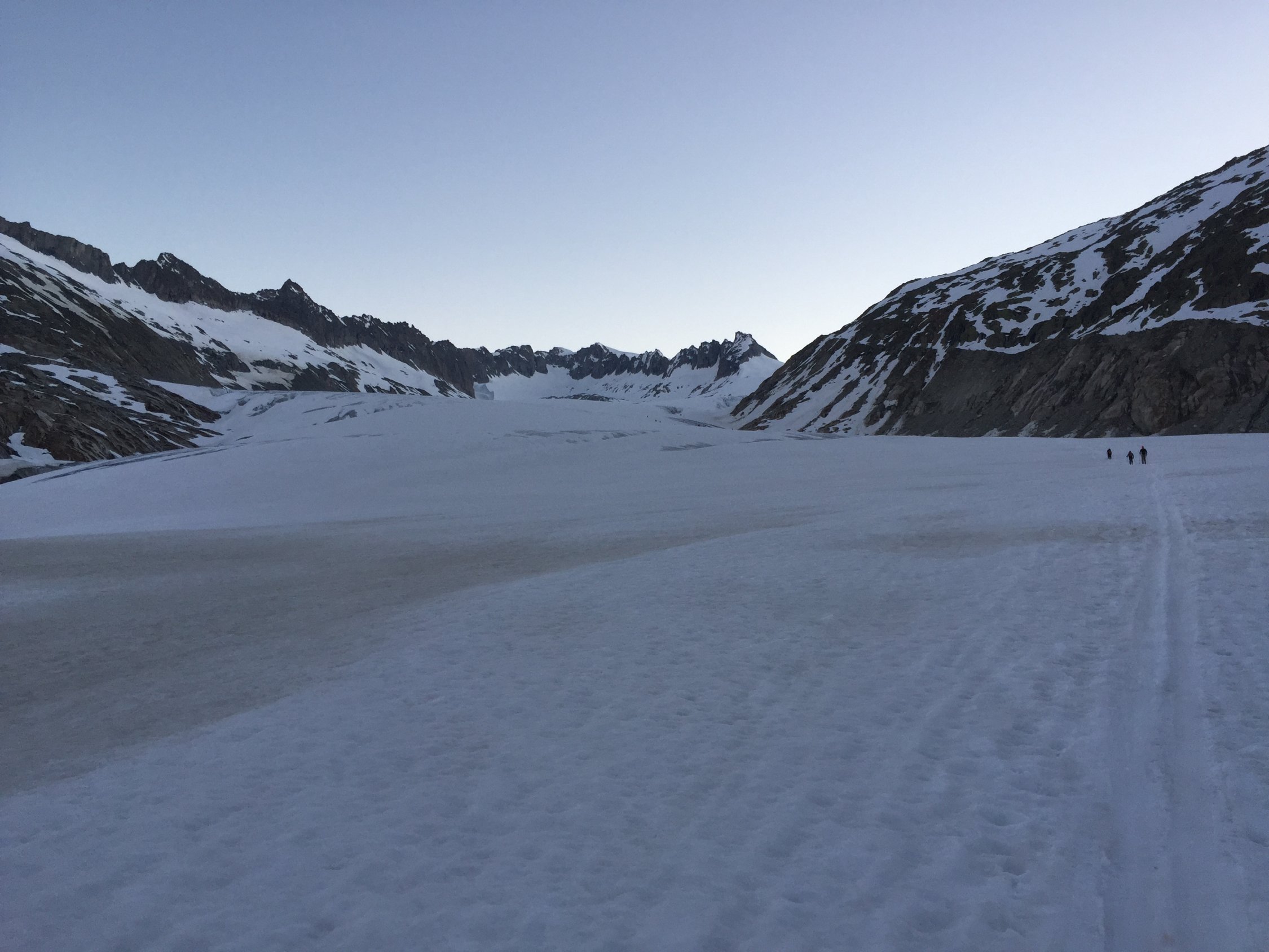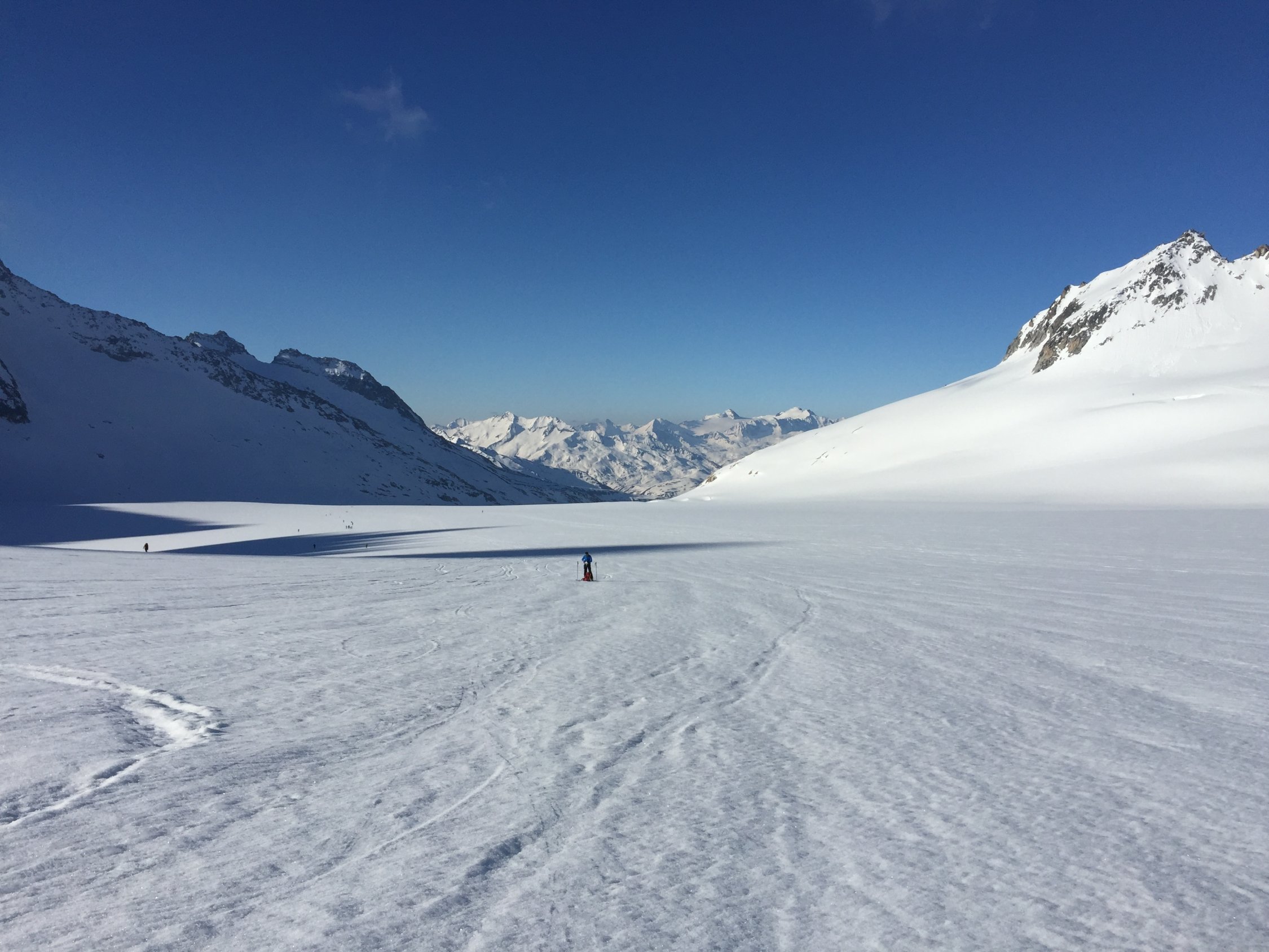 Gletscher noch gut gedeckt, obwohl, erste Blankeisstellen sind sichtbar, bis ca. 2600. Gewohnt langer Aufstieg auf gut tragender Schneedecke. In der Abfahrt nicht zu früh, dann Traumabfahrt bis nach Grossfirn, dann gut mit wenig schieben, Rest in Spur abwärts bis zur Eisgrotte.