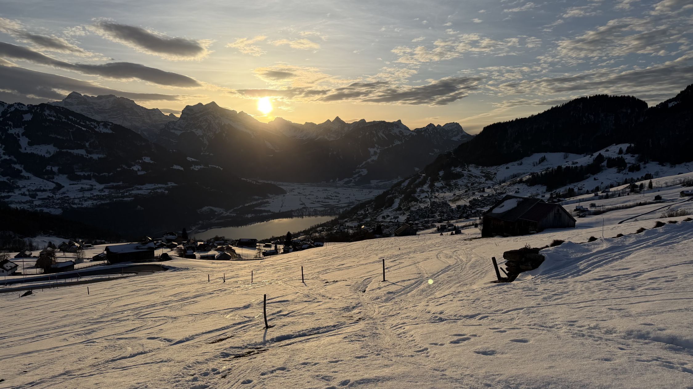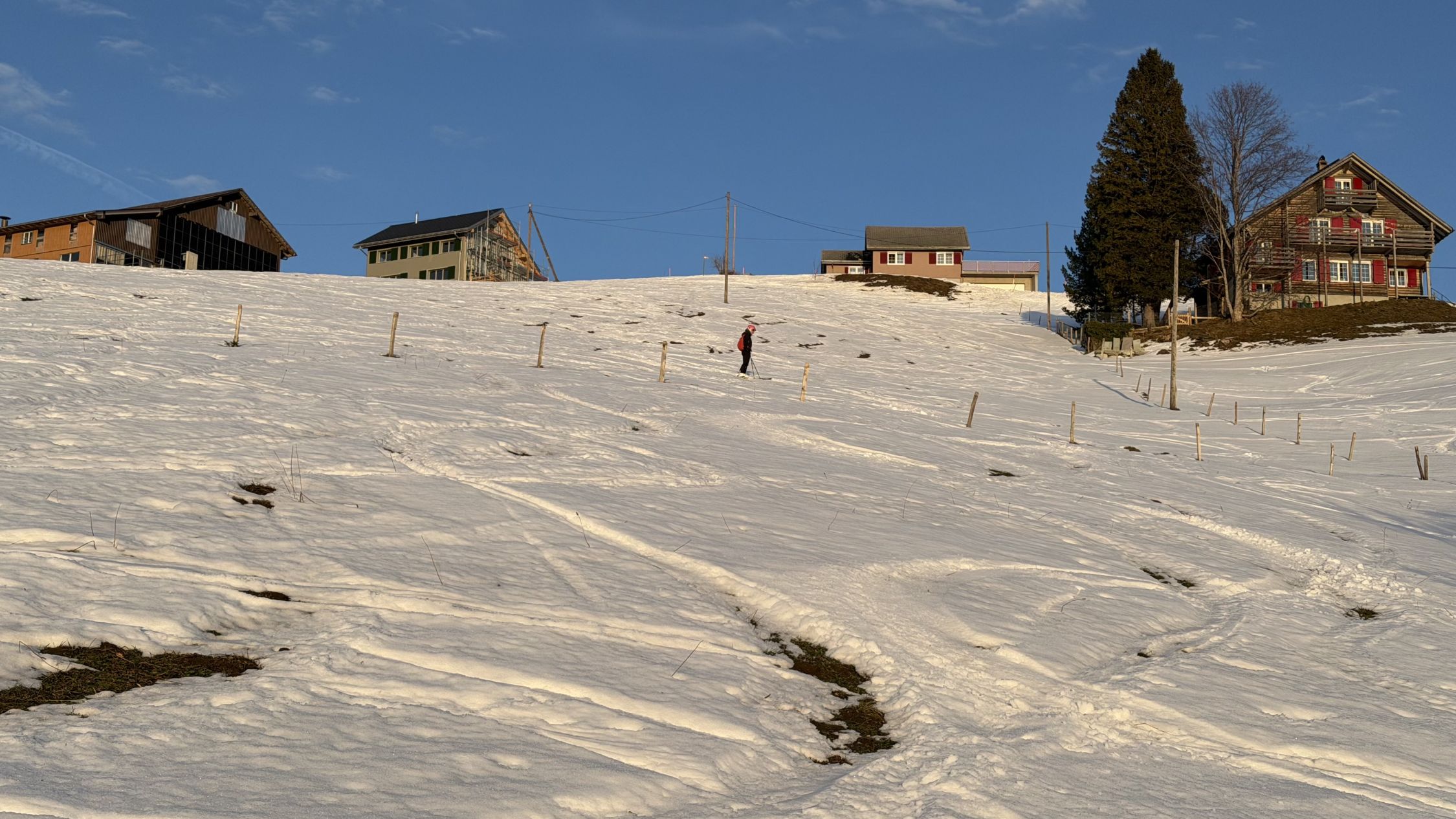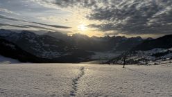 Spätnachmittagstürchen bis Tscherwald. Schnee sulzig, leider noch tiefer als erwartet. Abfahrt mit letzter Sonne war wichtig, danach zog es sofort an (wie bei uns gegen unten am Schatten) und bildete eine Harschkruste. Solange weich, ganz ok zu fahren.