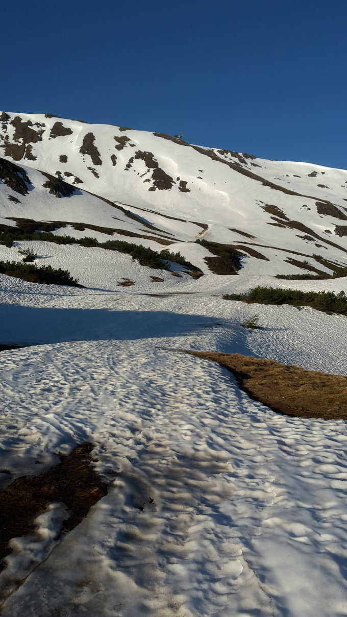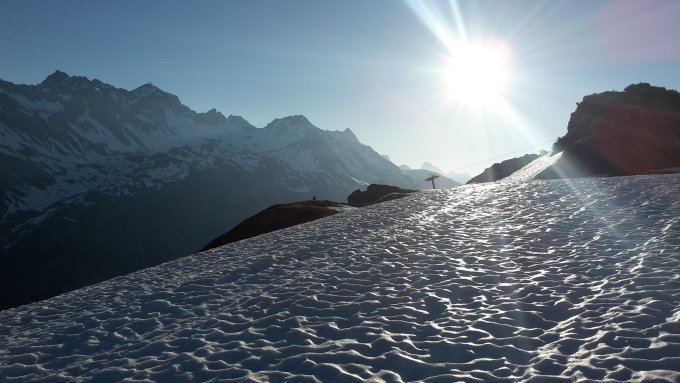 Beim Start um 5:45 bereits 10°C. Kompakter Sommerschnee mit weicher Firnoberfläche, perfekt zu gehen und zu fahren. Abfahrt um 8 Uhr.