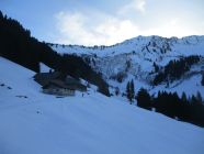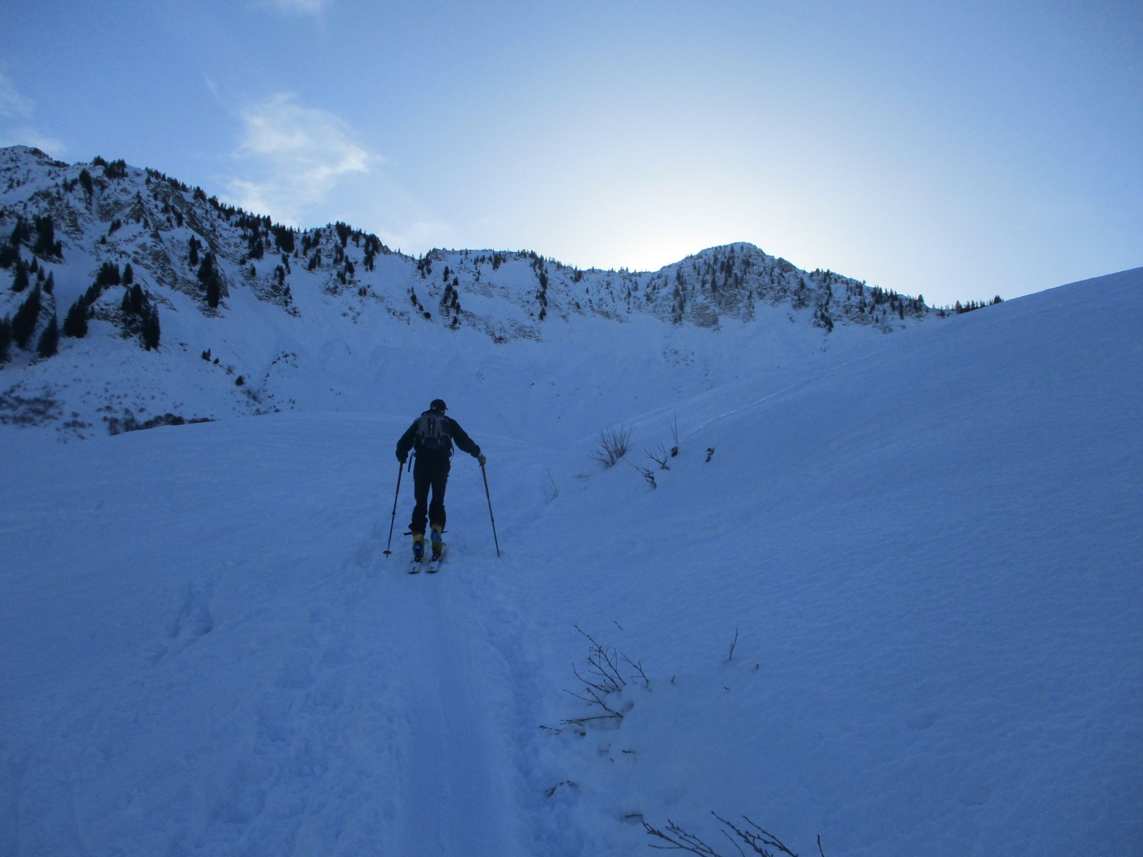 Heute morgen auf den Parkplätzen war gehörig was los. Um so überraschender war es, wie viele ruhige Teilstücke unterwegs genossen werden konnten. Im Abstieg genehmigte ich mir einen etwa 15-minütigen Vorsprung zu meinen Tourenpartnern auf Skiern, Bernd und Vladi. Hierbei erlebte ich über nahezu den gesamten Abstieg hinweg eine fantastische Ruhe und Einsamkeit.