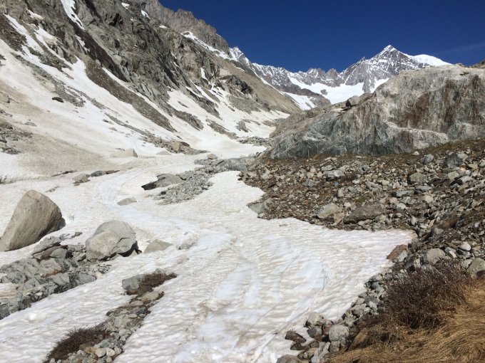 Top Verhältnisse! In der gesamten Nordflanke komfortabler Trittschnee, nur die letzten 3-5 m unterm Aletschjoch blank. Dort kann bei Bedarf noch bequem im Schnee stehend eine Eisschraube gesetzt werden, oben am Joch wurde am 26.5. von "Wandabfahrern" eine Eissanduhr eingerichtet, um die obersten 5m am Seil abzurutschen. Begehung mit 1 Leichtpickel bei den aktuellen Verhältnissen problemlos. Zustieg bis zum Bergschrund mit Ski&Harscheisen gut zu gehen. Der Bergschrund ist von unten gesehen rechts am einfachsten zu überwinden. Auf der Südseite des Aletschjochs die obersten 10m steil mit guten Tritten abklettern, dann können die Ski angeschnallt werden. Abfahrt mit wenigen Tragestellen gerade noch bis 2260m möglich. Am Aletschgletscher zwar spaltenbedingt einige Kurven gelaufen, aber keine Labyrinth-ähnliche Stellen angetroffen.