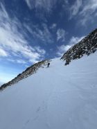 Wenig Schnee. Viel Wind. Die kurze Fußpassage im oberen Teil der Route ist gut machbar (gute Tritte in der linken Rinne).