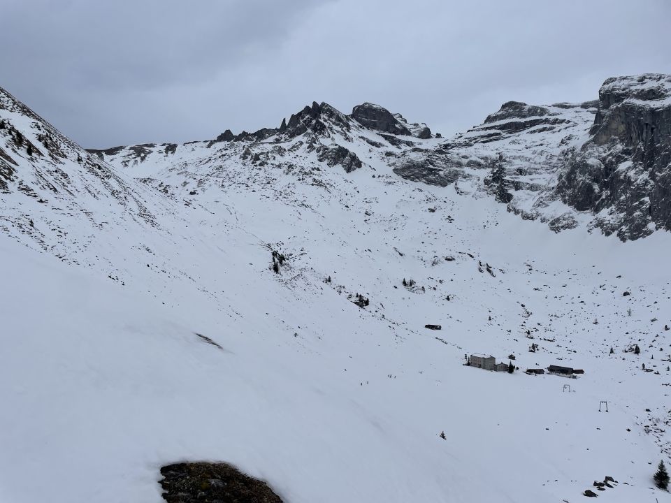 Sehr wenig Schnee und viele freiliegende Steine. Die Abfahrt war dann dank gefundenen Schneeverwehungen erstaunlich gut.