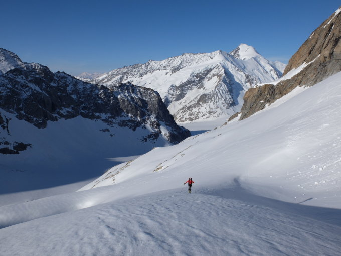 Im Couloir auf 3480m sind wir bis auf etwa 10m mit angeschnallten Skis aufgestiegen. Der Gipfelgrat hat zwar noch Wechten, er ist aber gut begehbar, auch seilfrei.