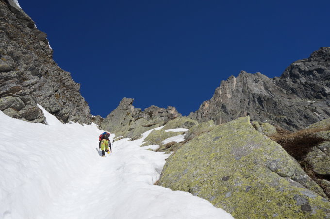 Topverhältnisse am Salbit-Südgrat und wir waren alleine! Zustieg erfolgt über Schneefelder, Gamaschen, Steigeisen und Pickel sind hilfreich. Bei der grandiosen Kletterei ist alles schneefrei und bis auf die vorletzte Seillänge alles trocken. Abstieg auf die Nordseite geht über steiles Schneefeld (Steigeisen und Pickel nötig) - wir haben vom Ausstieg leider keine Abseilstelle gefunden) Anschliessend mit zweimaligen Abseilen (an Bandschlingen um Felsblöcke) über die Felsstufen hinunter zum Couloir, welches sehr angenehm zum Abfahren ist und man ist superschnell wieder bei der Salbithütte.