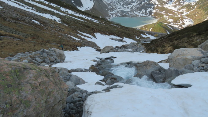 Ab Passstrasse hatte es heute unten im Bachbett bis auf 2x 10m noch knapp genügend Schnee für Aufstieg und Abfahrt.