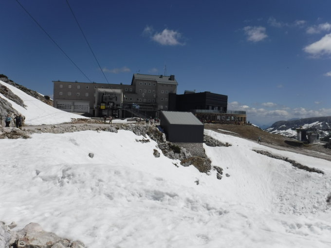 Tourenbeginn um 12:30 Uhr bei 26°C unter wolkenlosem Himmel. In 3 nordseitigen Hangbuchten liegt das Sicherungsseil noch unter einer Schneedecke. Die Hänge sind dort jedoch nicht steil. Die Schneefelder lassen sich unterhalb umgehen, bzw. im weichen Trittfirn überqueren. Die wenigen Kletterpassagen sind jedoch schneefrei. Auf der Lodge gab es heute Nachmittag eine Hochzeitfeier. Da man bei der Seilbahnauffahrt keinen Einblick in die Nordwand hat, sondern sich nur ein Bild über die Schneeverhältnisse in den Klettersteigen „Himmelseck“ und „Gams“ machen kann, stieg ich nicht über die „Nordwand“ auf. Beim Tiefblick von der Aussichtsplattform „5finger“ sah ich, daß zumindest die Querung zur Nordwand schneefrei ist.