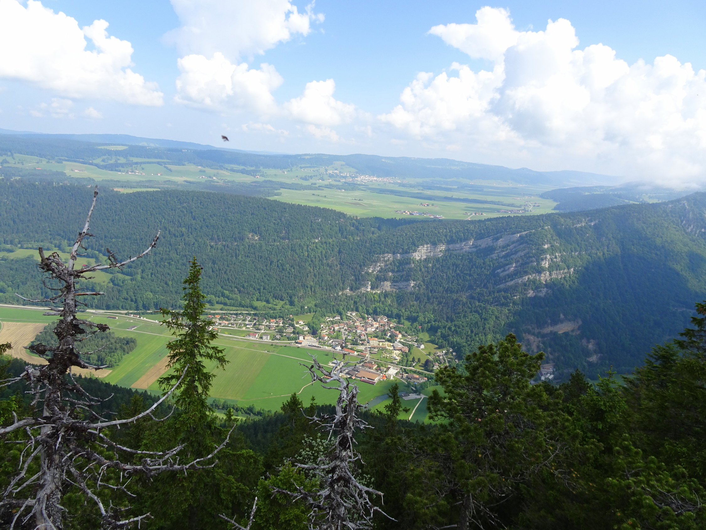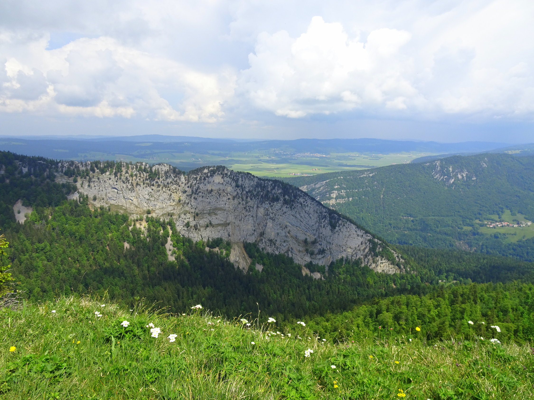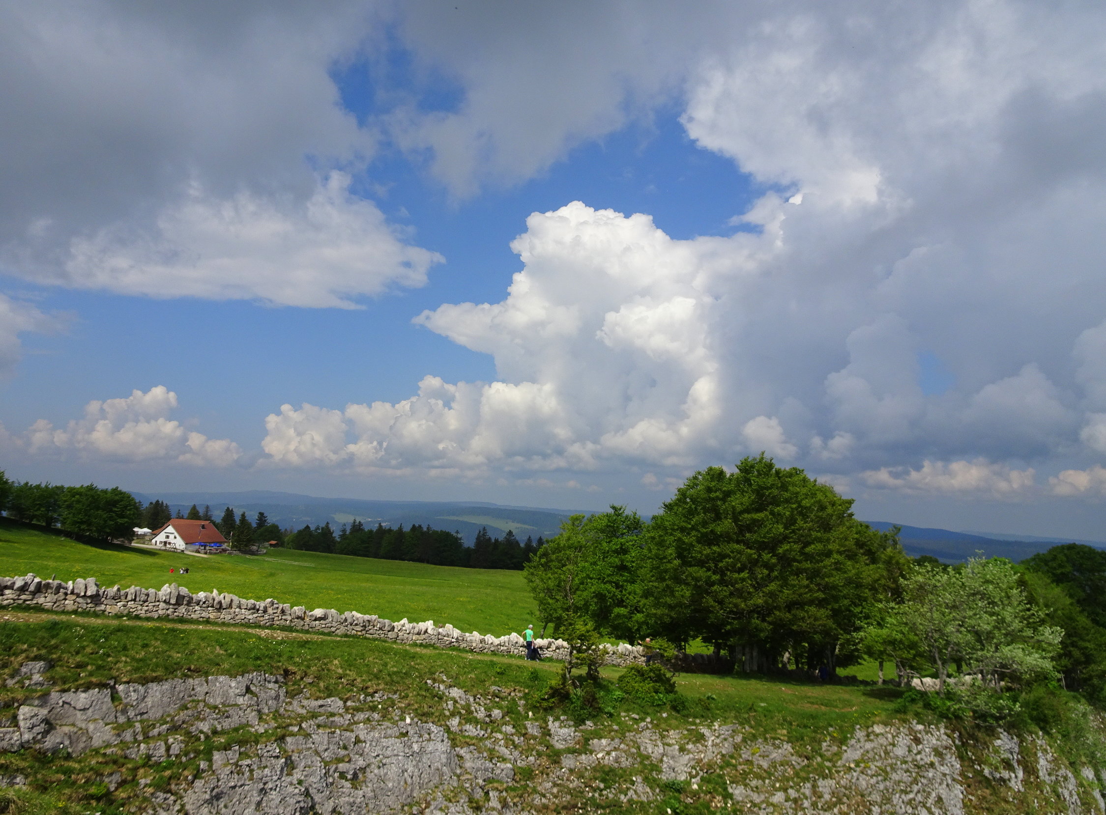 Die Wolken bauten sich sehr Früh auf und um Mittag begann es zonenweise zu regnen. Mich erwischte es in der letzen halben Stunde, zwischen Ferme Robert und Noiraigue. Das Gewittert hockte genau über dem Val de Travers und Creux-du-Van. Ich habe an die Wanderer gedacht die, spärlich ausgerüstet, noch auf dem Creux waren oder sogar noch im Aufstieg um die Mittagzeit! Lustig hatten sie es bestimmt nicht.