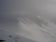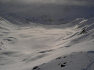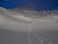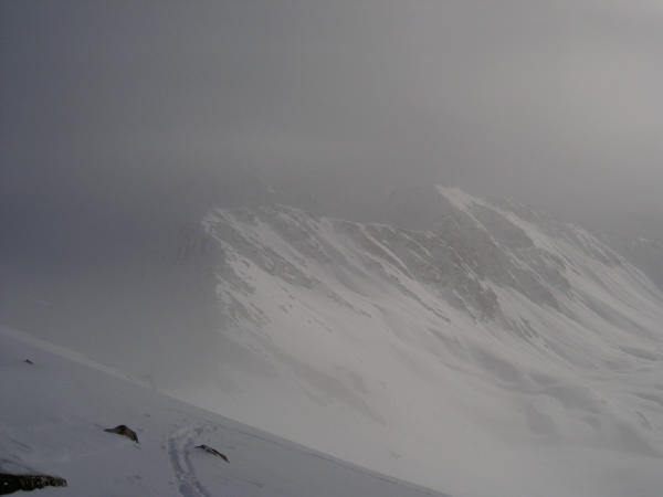 Aufstieg erst um 13.30 Uhr. Starker Wind in der Talsohle, Unten 30 cm verblasener Beton, oben guter, ruhiger Pulver, ca 40 cm. Einzelne Lockerschneerutsche gesehen. Keine Setzungsgeräusche.