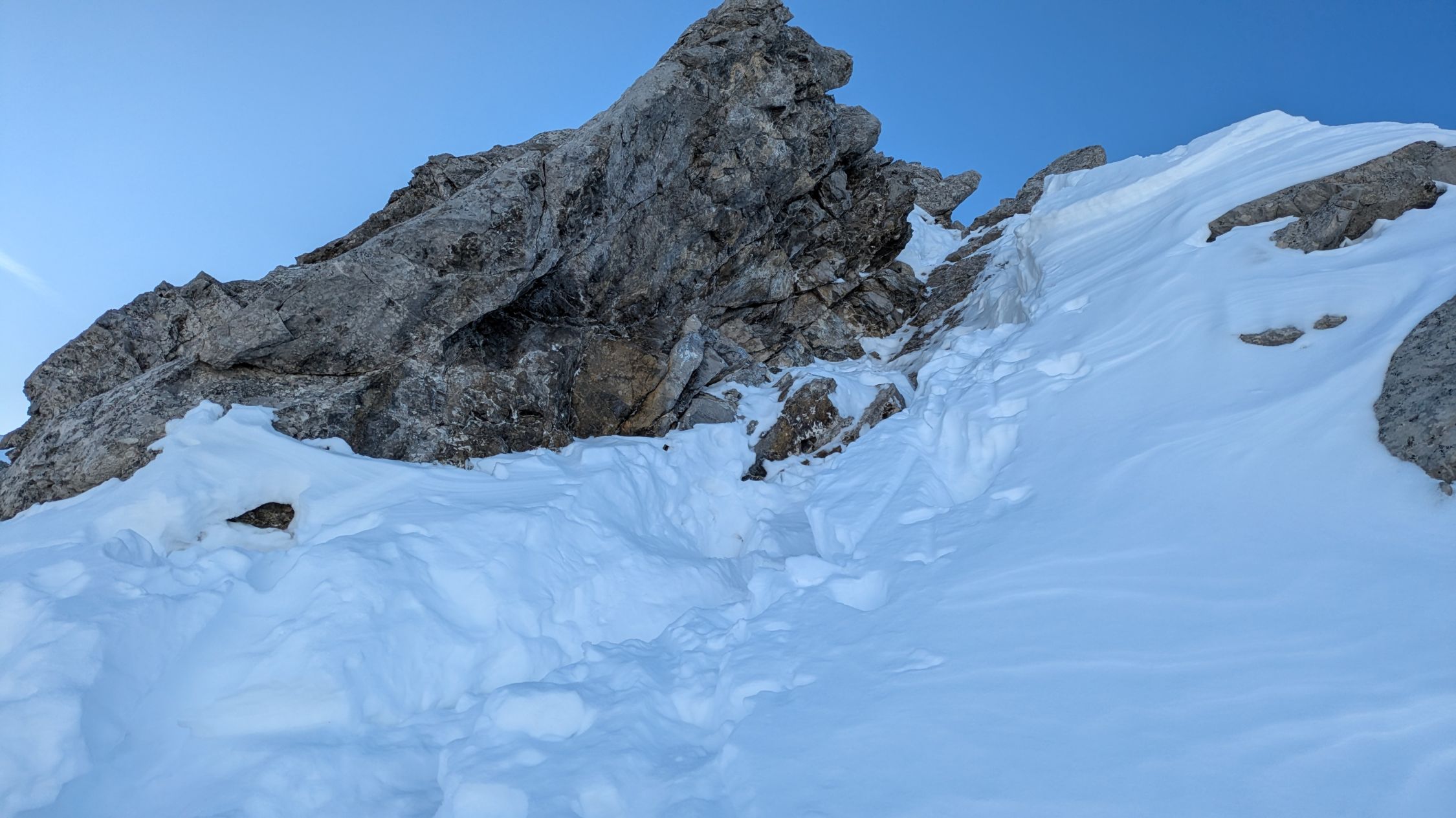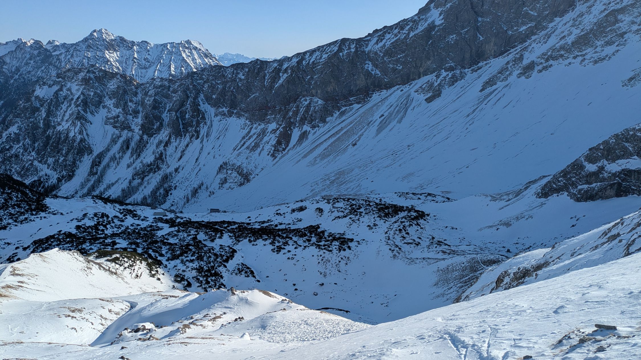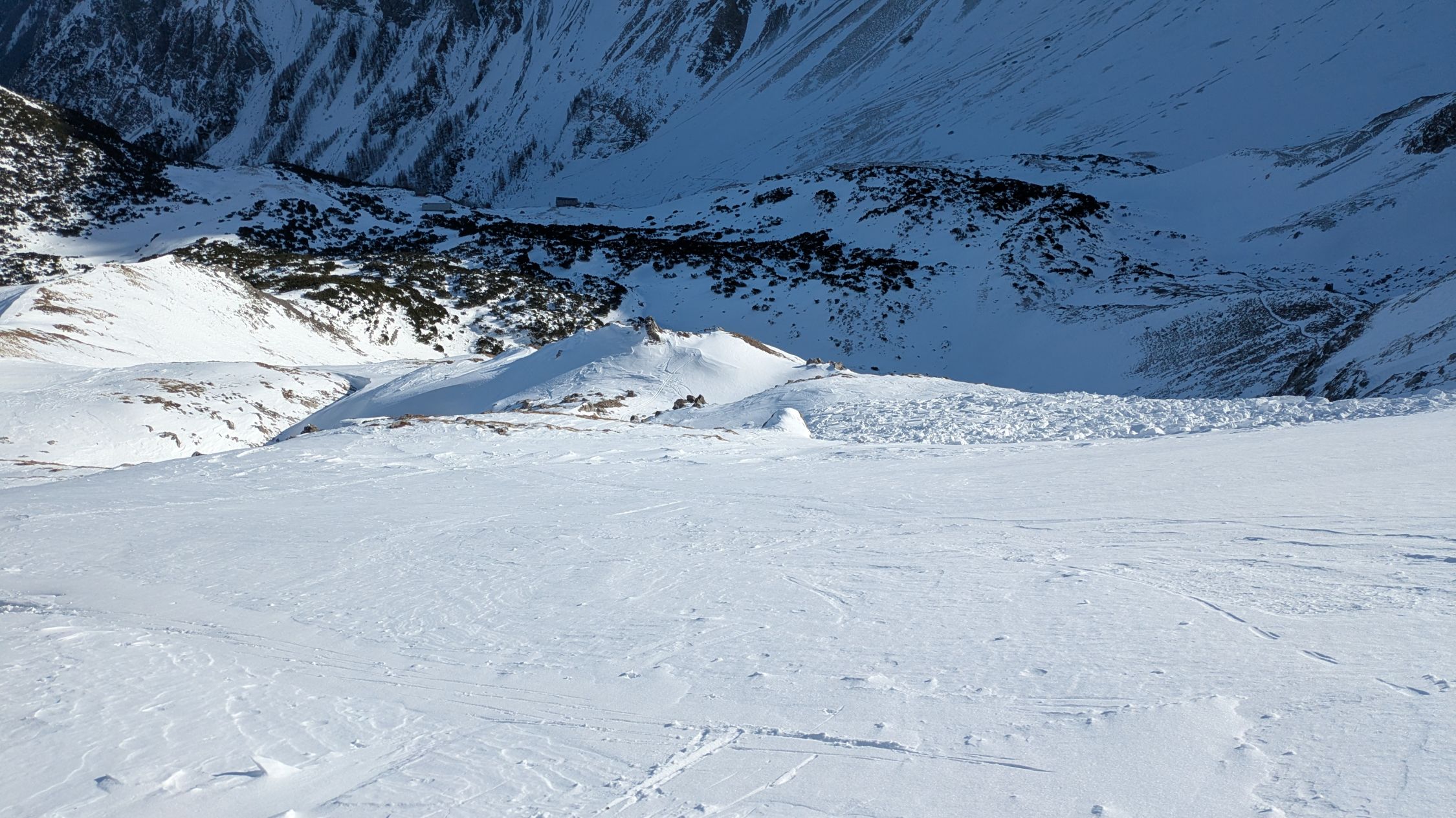Wenig Schnee, starker Wind vor der Hütte. Oben teilweise abgeblasen.