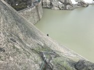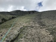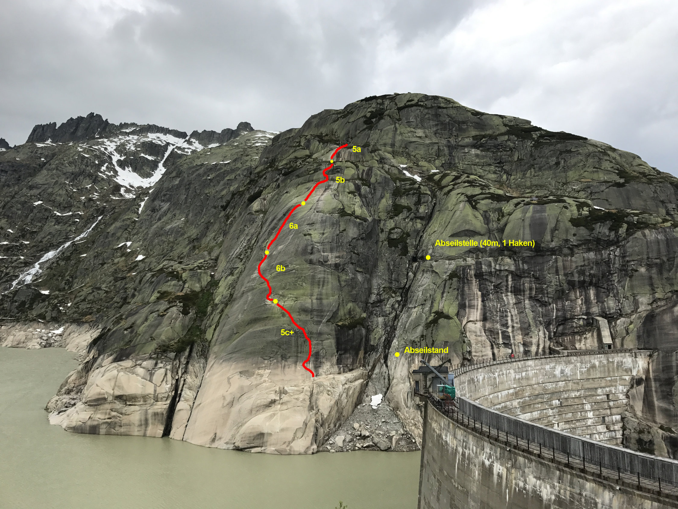 Rückzugsmöglichkeiten: Nicht optimal. Mit etwas Materialverlust (Abseilstände hat es nur z.T.) kann man zurück auf das Felsband abseilen, von da (selbst absichern) in leichtem, aber z.T. losem Gelände (wohl ca. III / IV) durch das Couloir zurück wieder auf den Wanderweg klettern. Alternativ hilft wohl nur schwimmen...