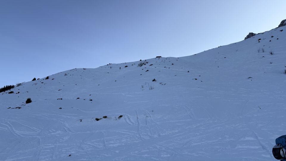 Traumhaftes Wetter und soweit knapp genug Schnee. Aufstieg ging soweit gut mit nur ganz kurzer Tragpassage im untersten Steilhang etwa auf 1000m.