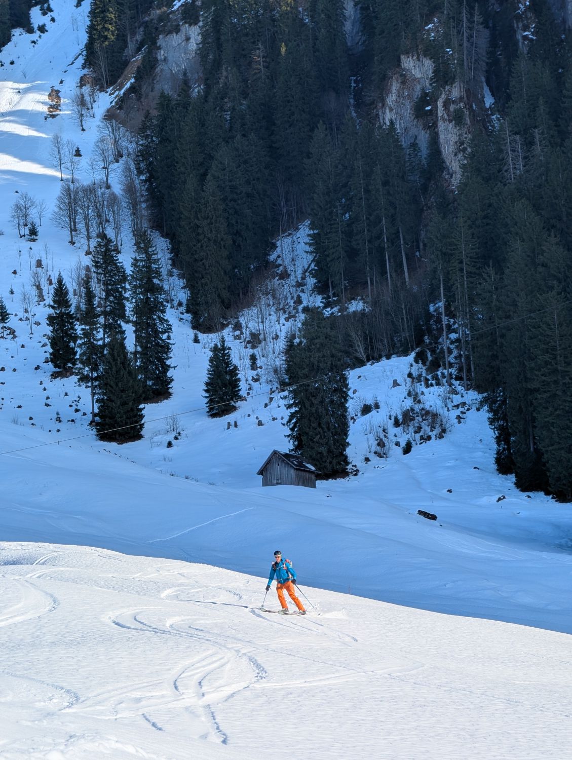 Abfahrt Richtung Norden, über Galtenbüel und Tierfäderenegg nach Waag. Hier ziemlich gut beschneit, schwerer Pulver oben und sulzig unterhalb von ~1200 m (ausnahme: eisiger Abschnitt des Trails durch Mittelwald). Es hat spass gemacht.