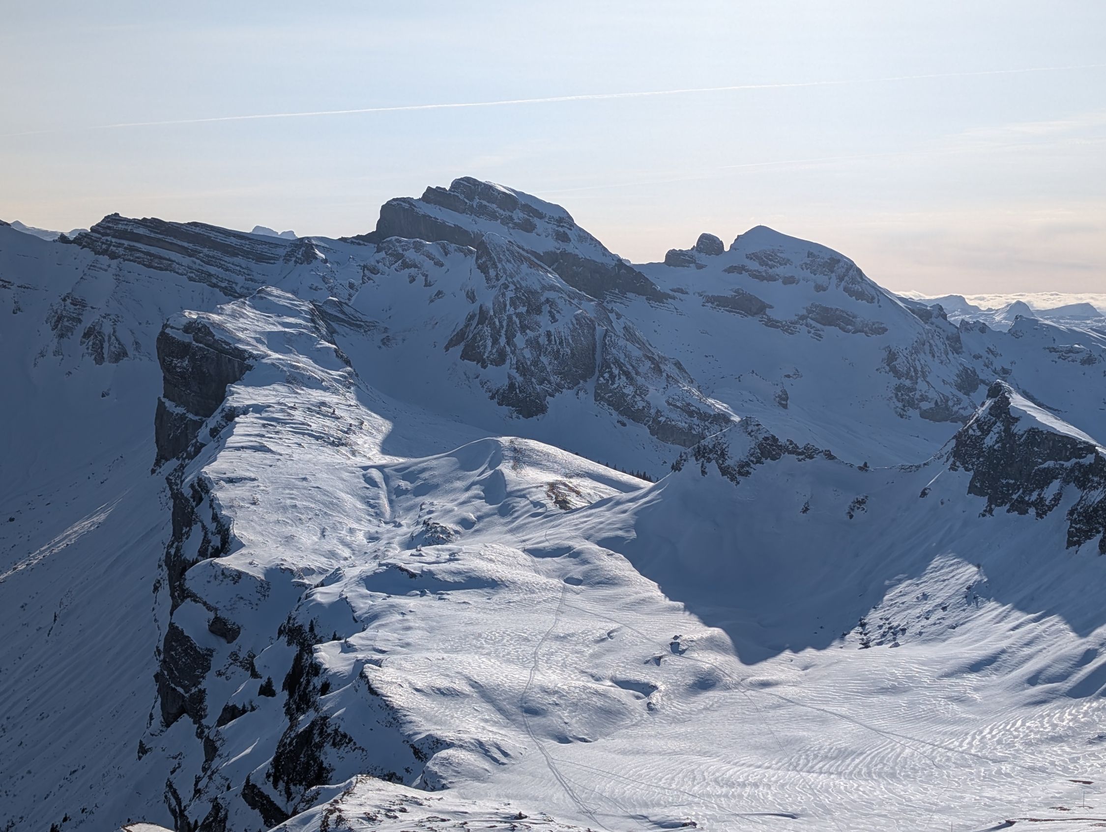 Noch 1-2 Tage bleibt es wahrscheinlich so, aber ohne Neuschnee werden mehrere Abschnitte (besonders zwischen p.1833 und dem ersten Gipfelkreuz) bald nicht mehr befahrbar sein. Die Nordseite wird etwas länger halten.