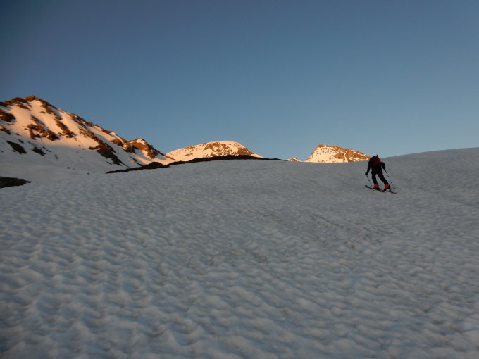 5.5°C beim Start. Nur mässig gefrorene Schneedecke, aber meist tragend. Durchgehend Schnee vom Berghaus Splügen mit zwei, drei Skitragstellen in der Traverse südlich des Lattenhornsattels. Wir sind in bestem Trittschnee bis kurz unterhalb des Gipfels aufgestiegen und erst am Schluss über die Gipfelfelsen auf der Südseite zum höchsten Punkt. Steigeisen waren nicht nötig.