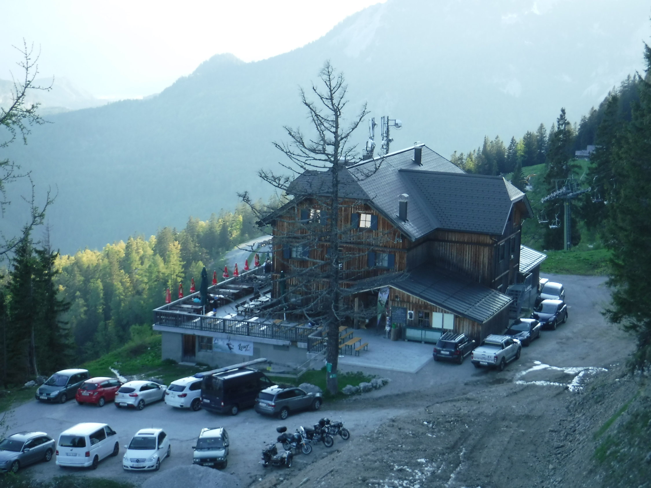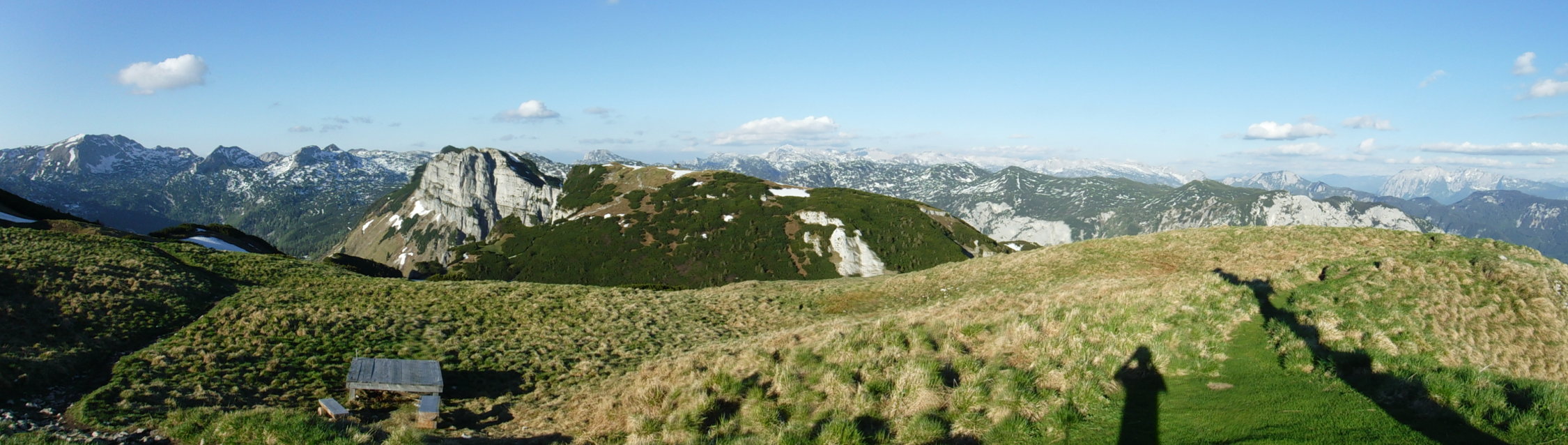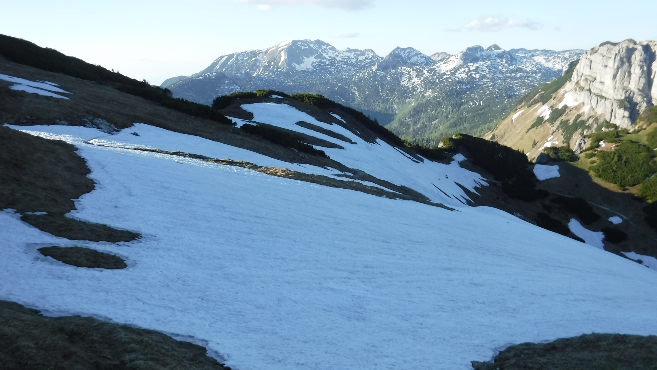 Tourenbeginn um 17:00 Uhr bei 20°C unter wolkenlosem Himmel. Der Steig ist völlig schneefrei. Nicht jedoch der Abstiegsweg (Normalweg). In der Senke zwischen Loser und Hochanger mit dem Mobilfunkmast und im nordseitigen Hang dorthin liegen noch einige Schneefelder, die sich aber bei warmen Verhältnissen problemlos queren, bzw. überlaufen lassen.